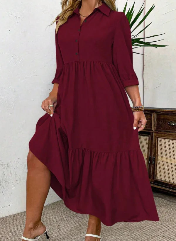 Omfamna enkel elegans med denna vinröda maxiklänning med knappar och flera lager i dammodell. Designad för en sömlös övergång från dag till kväll, erbjuder den en tidlös look med en smickrande silhuett som passar alla kroppstyper. Perfekt för vardagliga dagar eller avslappnade kvällar, detta mångsidiga plagg är förutbestämt att bli en favorit i din garderob.