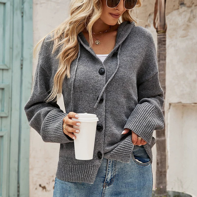 Damkofta med huva – Stickad – Avslappnad passform – Knappar – Dragskohäm