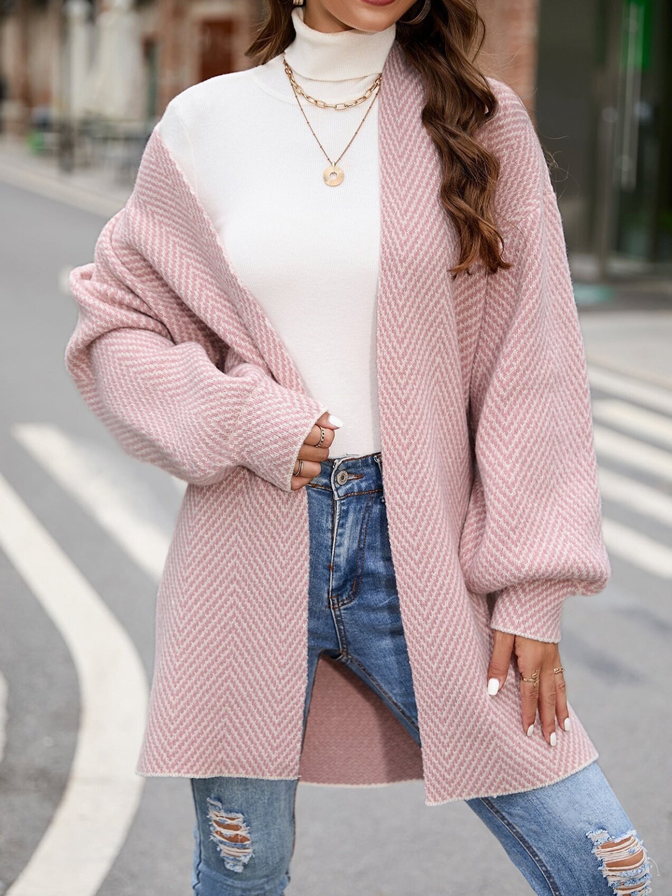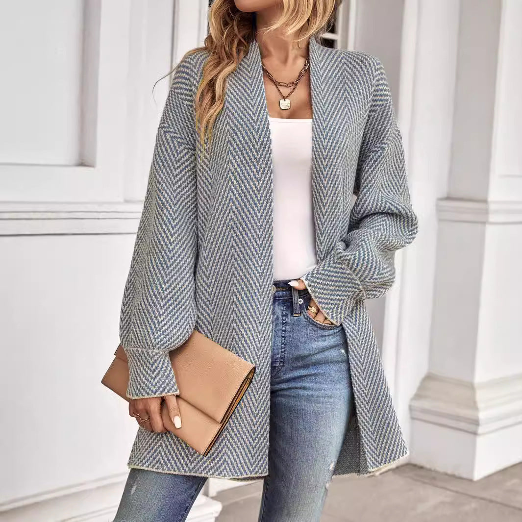 Damkofta – Mjukstickad – Avslappnad Passform – Öppen Front – Fiskbensmönster