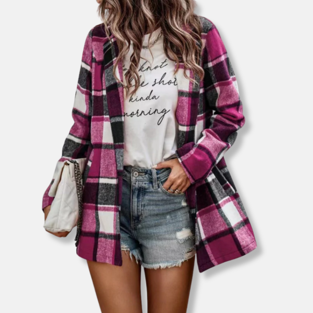 - Design: Oversized passform, rutigt mönster, långa ärmar, öppen front
