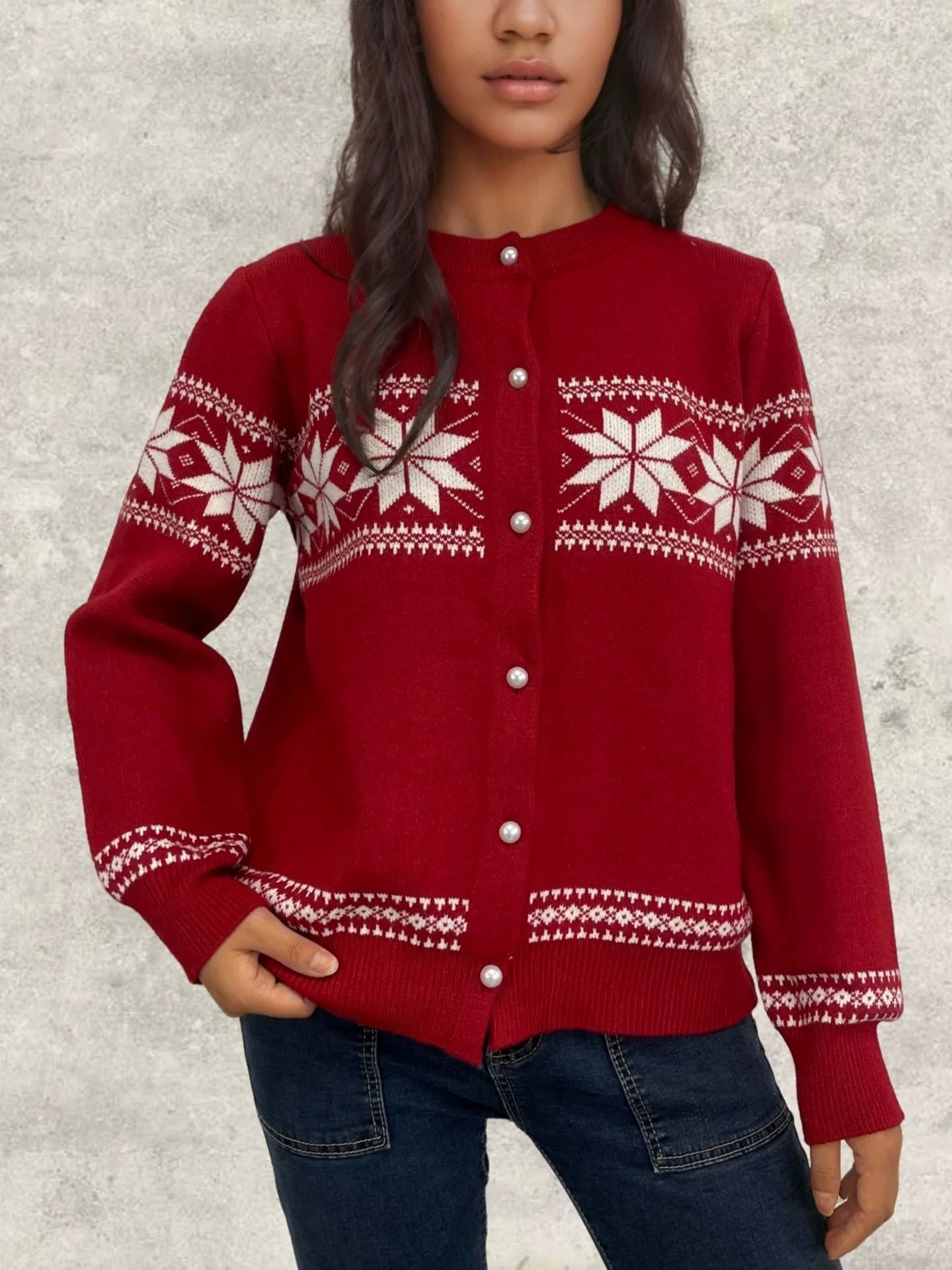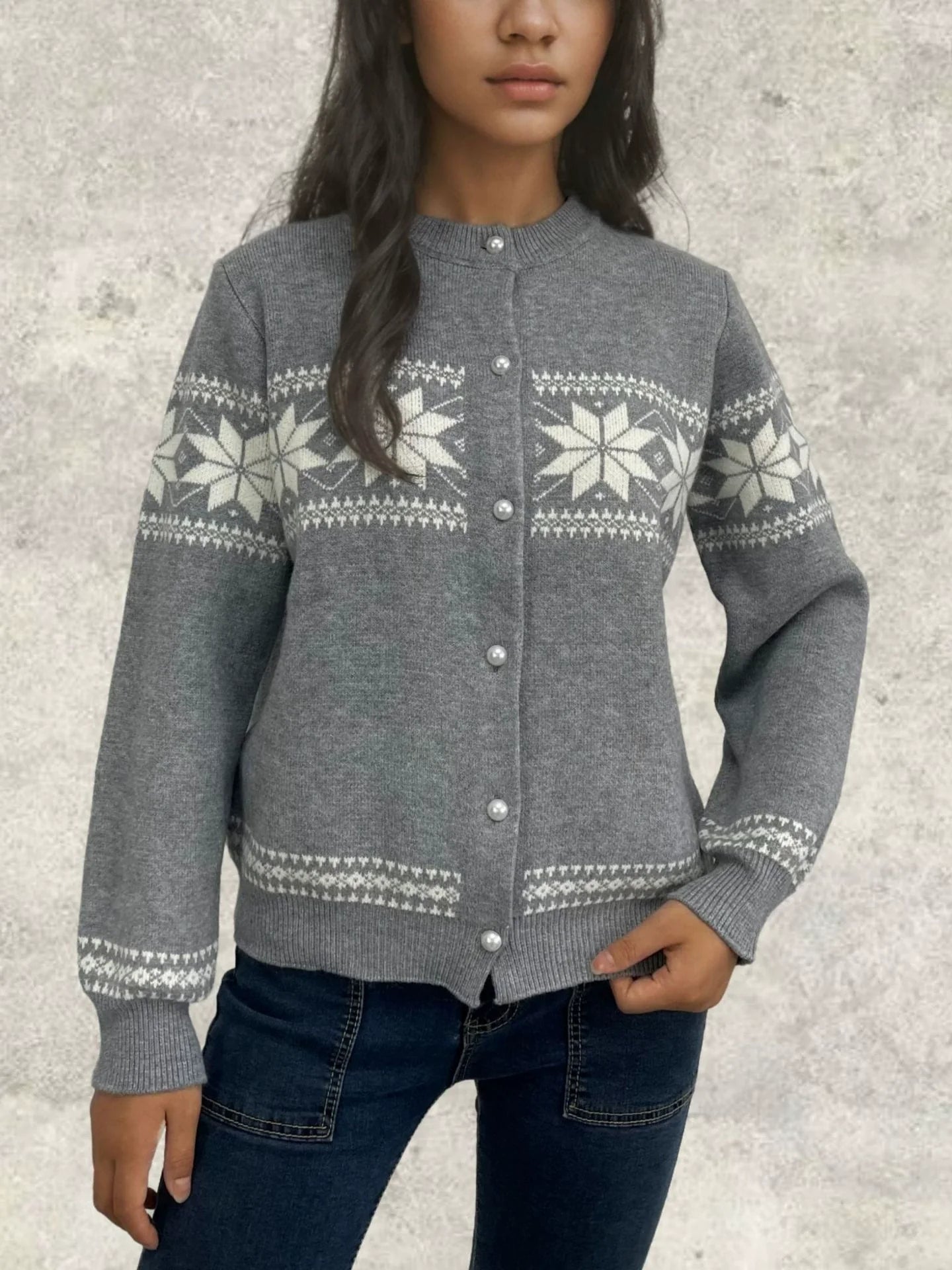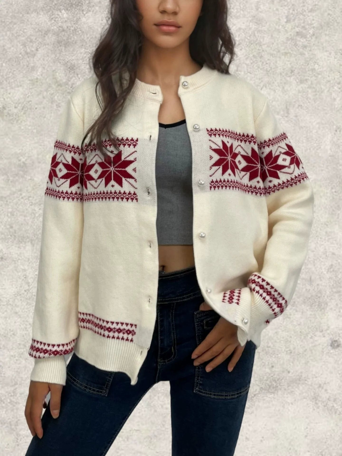 Damkofta – Ullstickad – Normal passform – Snöflingemönster – Knäppning fram
