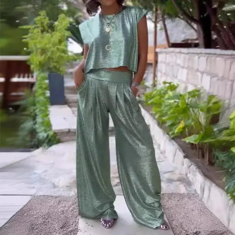 - Design: Tvådelat set med ärmlös croptop och vida högmidjebyxor i avslappnad passform