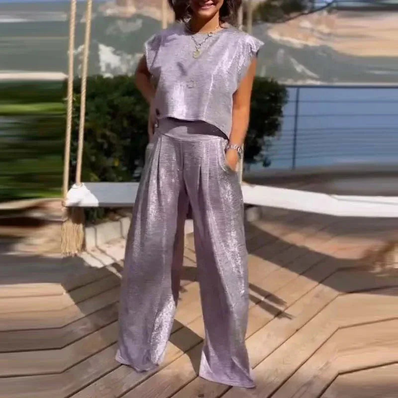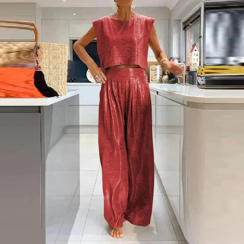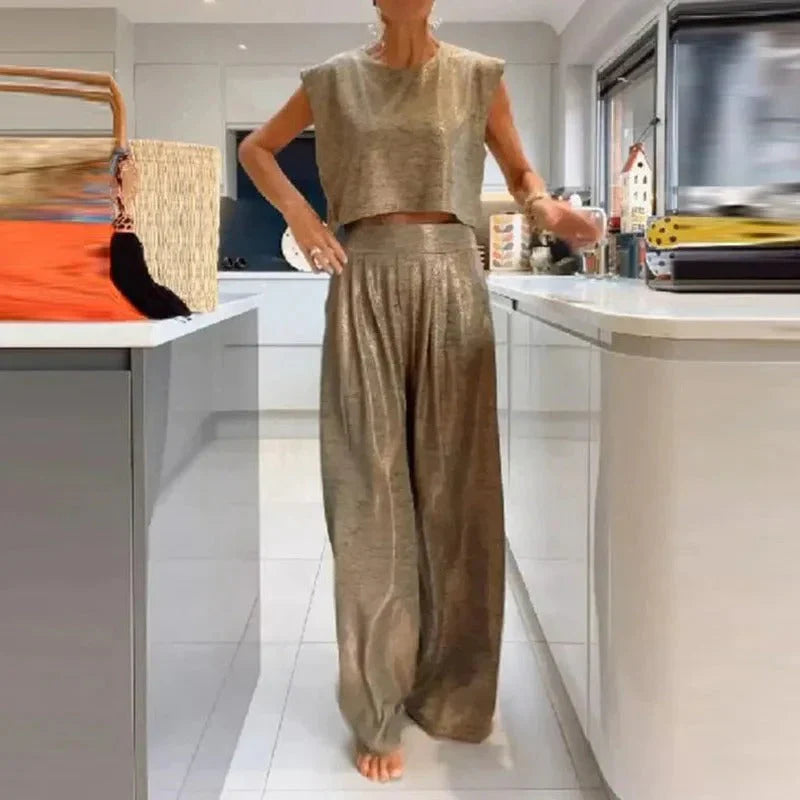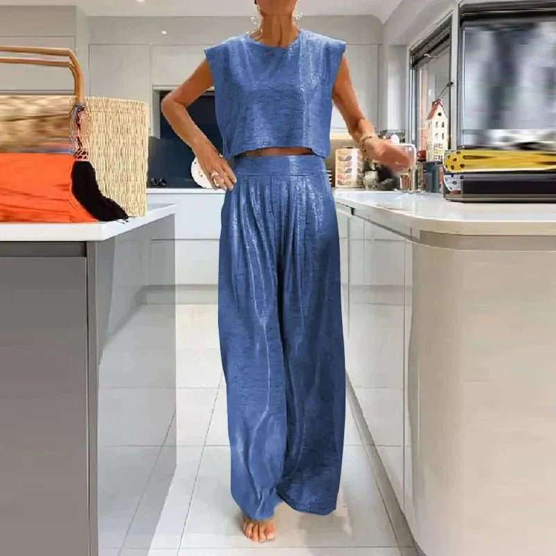 Damset – Èrmlös Croptop – Vida Högmidjebyxor – Avslappnad Passform från Eva-Jansson. Detta eleganta damset med ärmlös crop top och vida byxor med hög midja ger ultimat komfort och stil för en avslappnad look, perfekt för mode med fokus på välbefinnande.