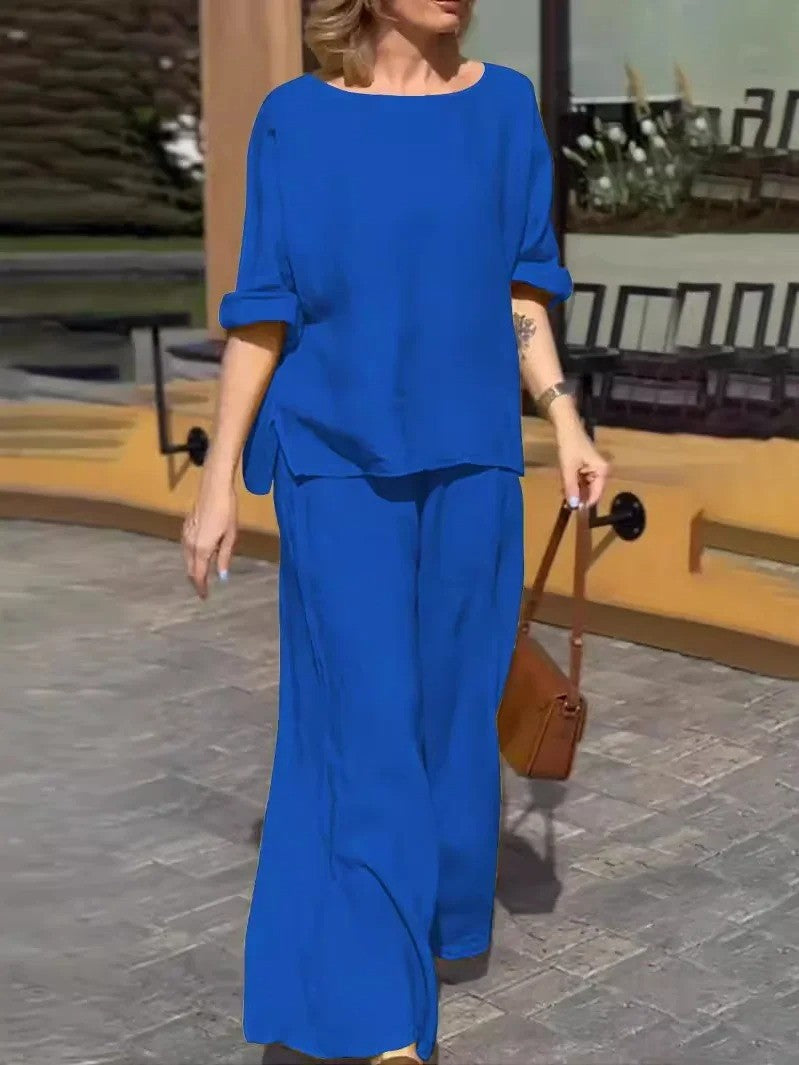 Damset – Halvlång Ärmtopp och Vida Höga Byxor – Avslappnad Passform – Andningsbart Tyg
