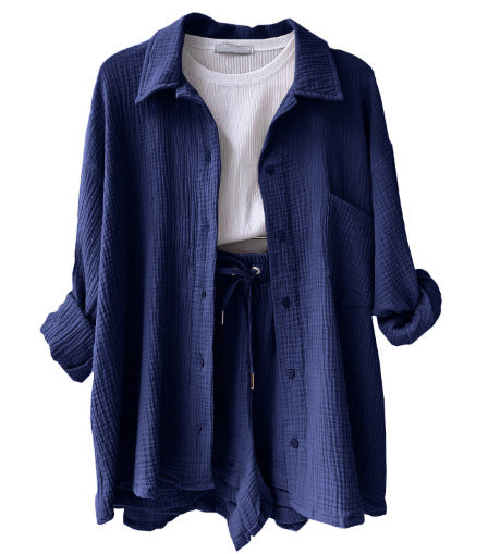 Damset – Högmidjade Shorts med Dragsko – Skjorta med Krage – Crinkle Look – Avslappnad Passform