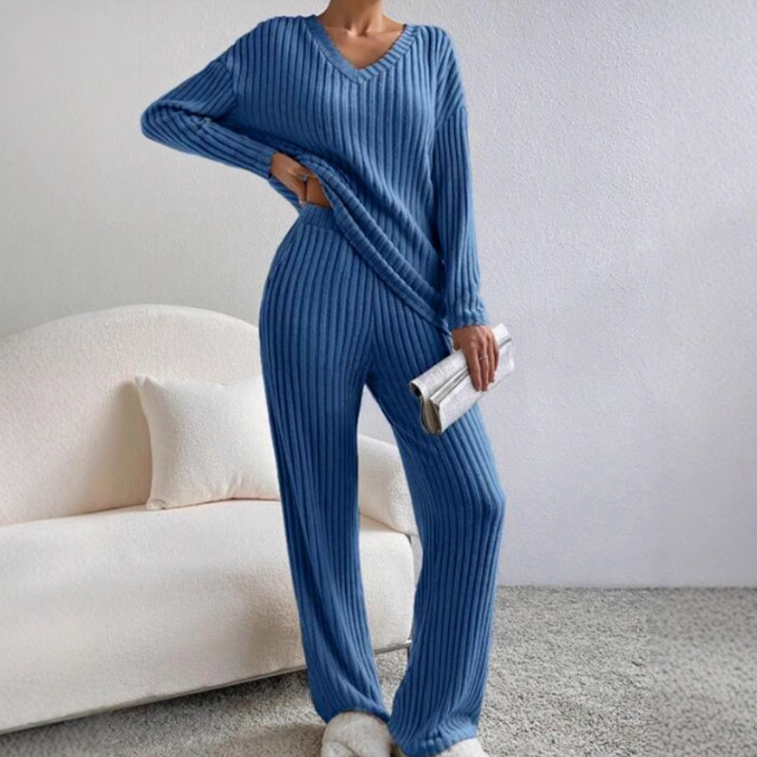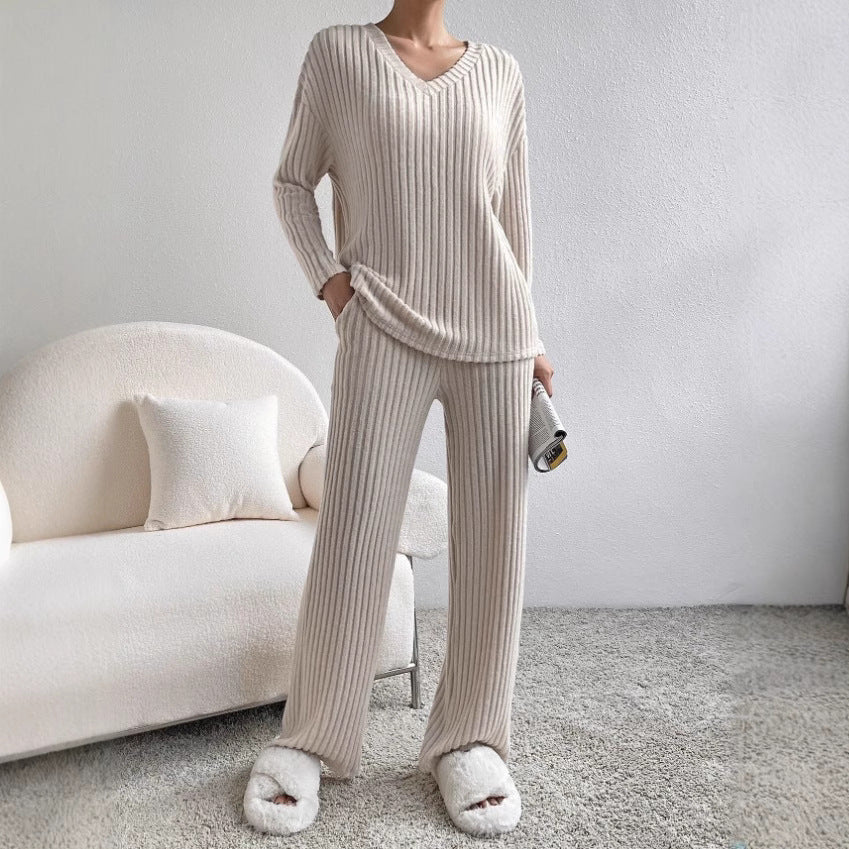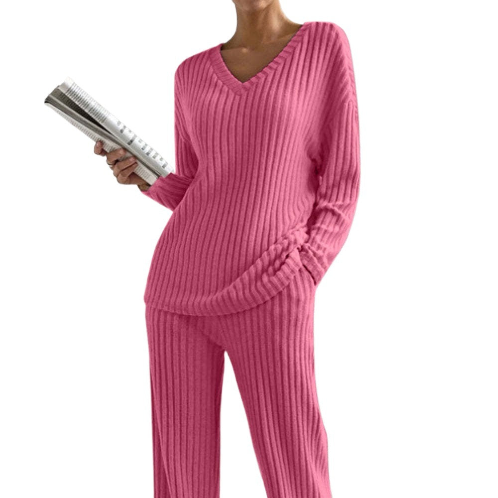 Damset i stickat – Ribbad V-ringad topp – Avslappnad passform – Raka byxor
