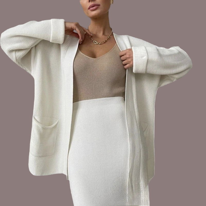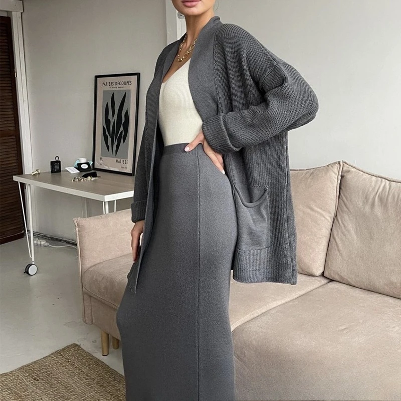 Damset i stickat tyg – Oversize kofta med öppet front – Hög midja pennkjol midi