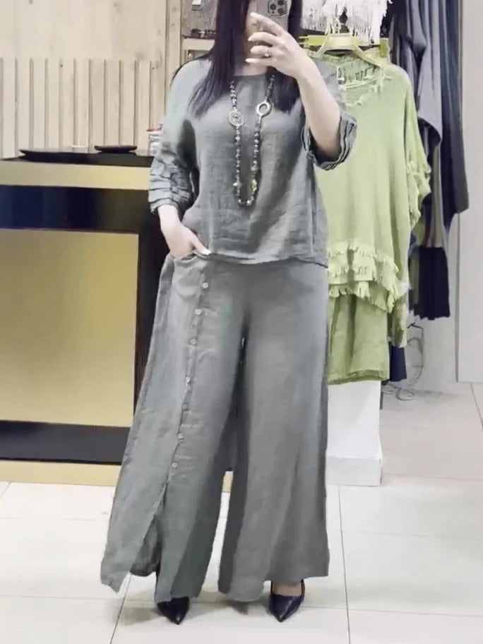 Damset – Linne – Avslappnad långärmad topp – Vida byxor med knapplist