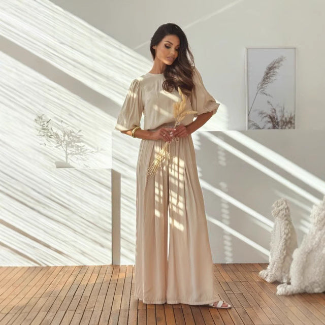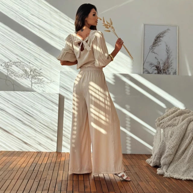Damset – Lös Topp med Ryggrosett – Vida Byxor med Resårmidja i Andningsbar Mix