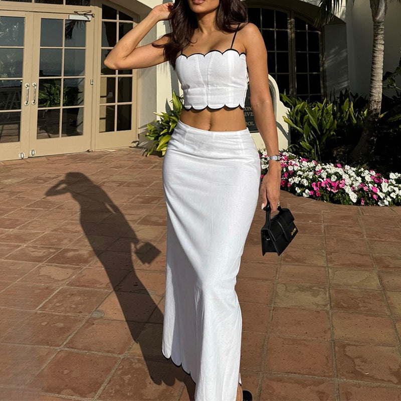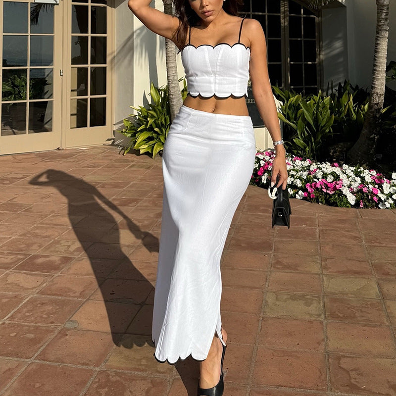 - Design: Slim-fit crop top med skulpterade kanter och midikjol med utsvängd fåll
