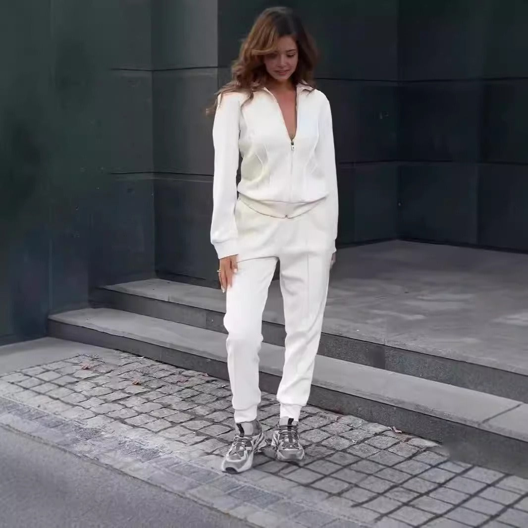 Damset med kofta och byxor – Stickat tyg – Avslappnad passform – Dragkedja – Avsmalnande ben