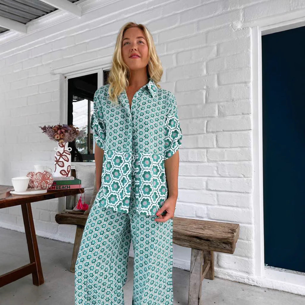 Damset med skjorta och byxor – bomullsblandning – avslappnad passform – geometriskt mönster – kortärmad skjorta med krage