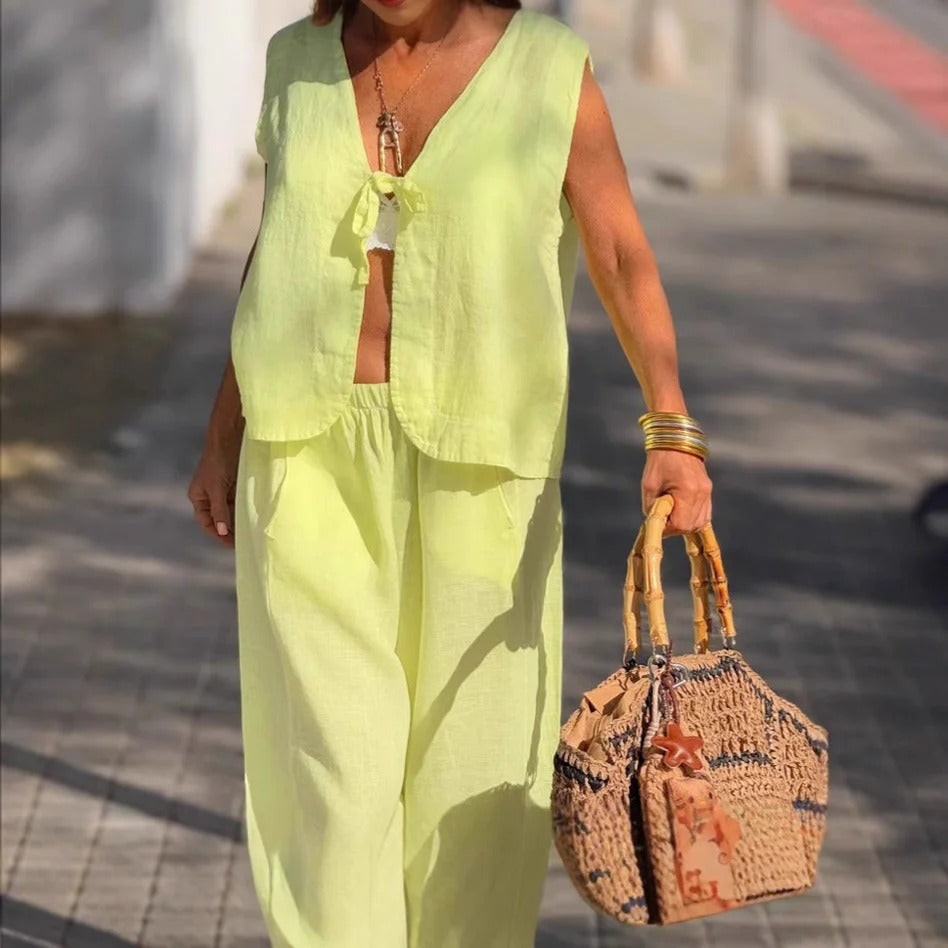 Damset med topp och byxa – Ärmös V-ringad topp – Vida byxben