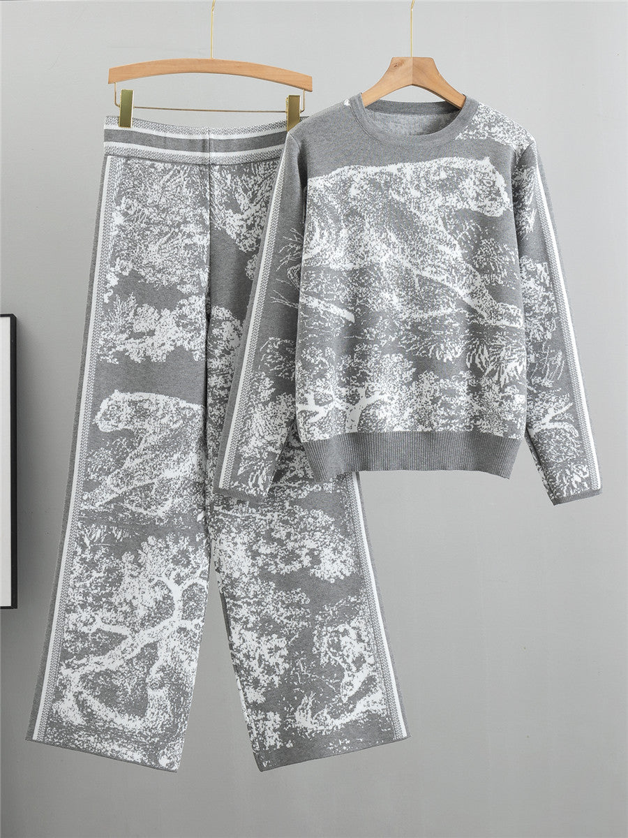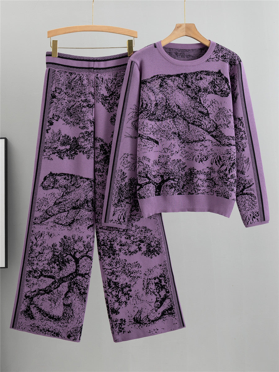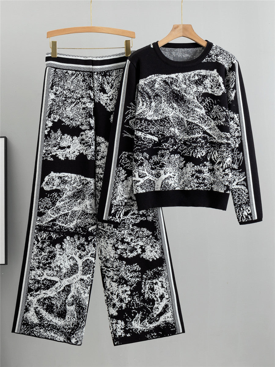 Damset med tröja och byxa – Jacquardstickad – Vida ben – Hög midja – Avslappnad passform