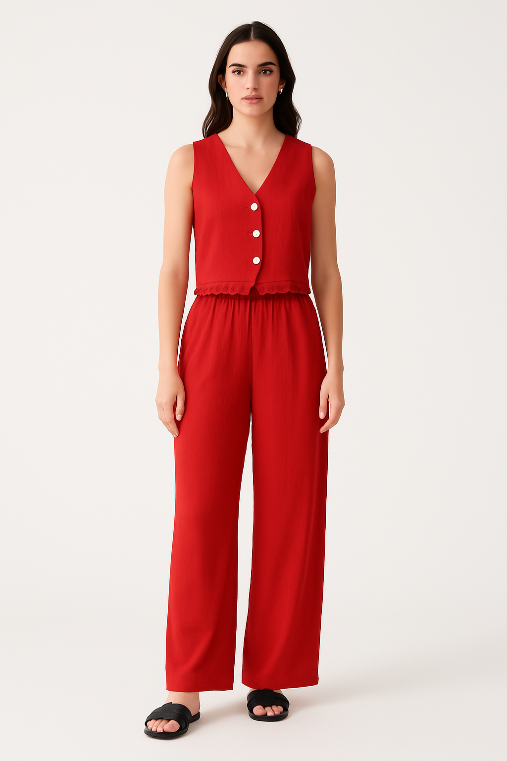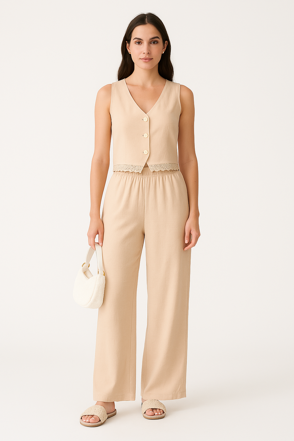 Damset med väst och vida byxor – Skräddad passform – Spetsdetalj – Andningsbart tyg