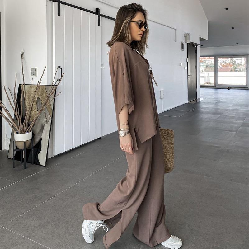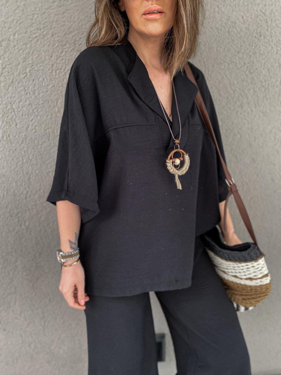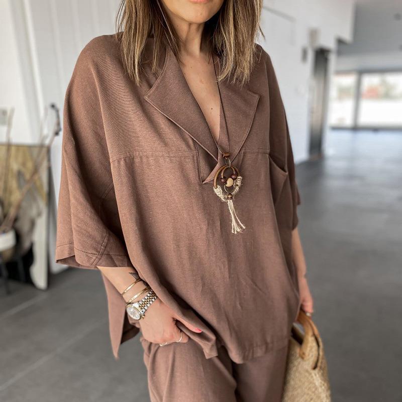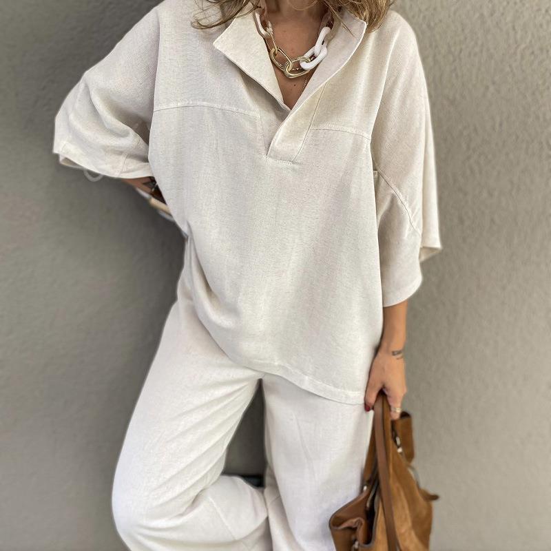 Damset – V-ringad topp med krage – Vida hellånga byxor – Avslappnad passform