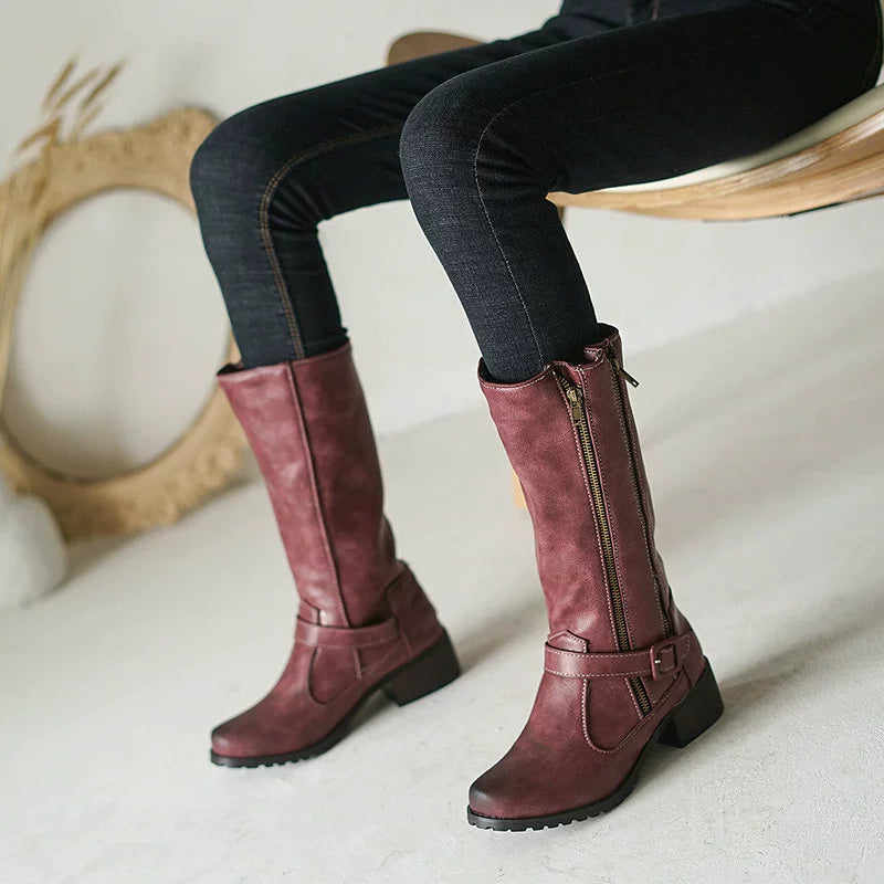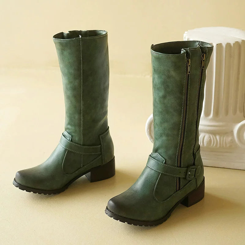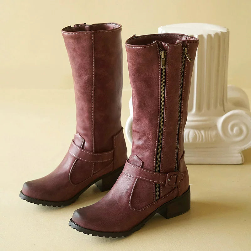 Damstövlar – Hög Modell – Rund Tå – Låg Klack – Spänne och Dubbla Dragkedjor