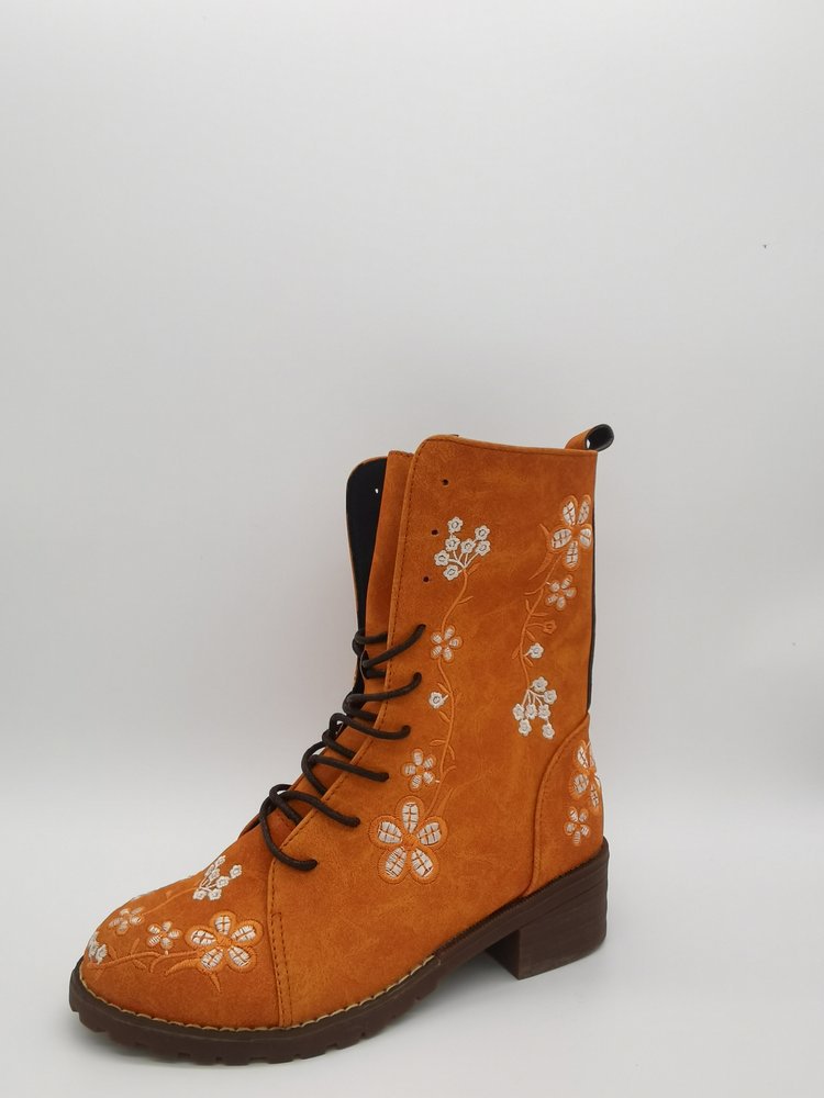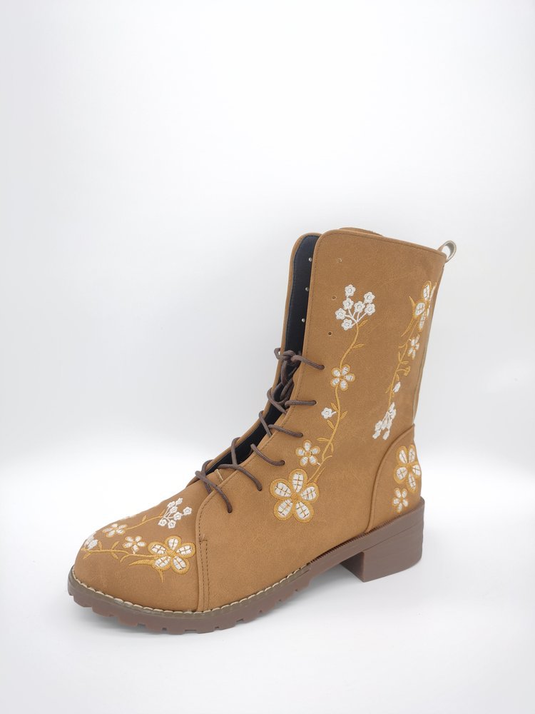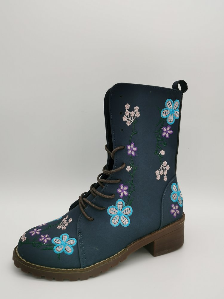 Damstövlar i mellanhöjd – Blommig brodyr – Blockklack – Snörning med dragkedja