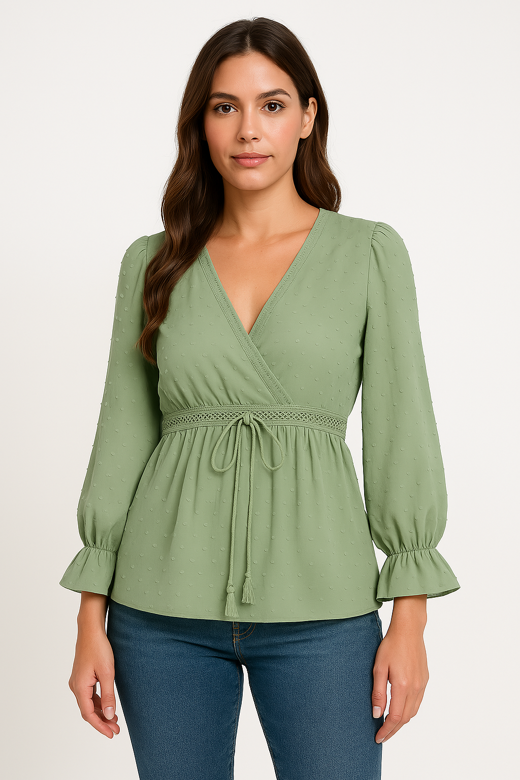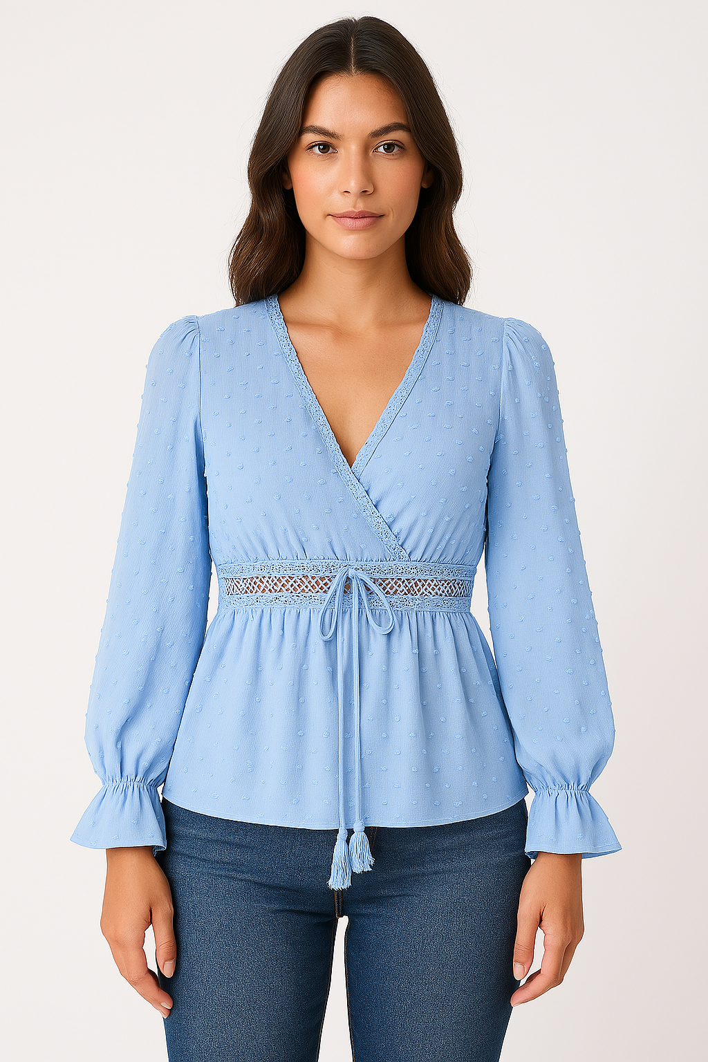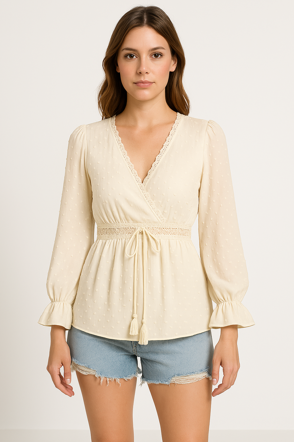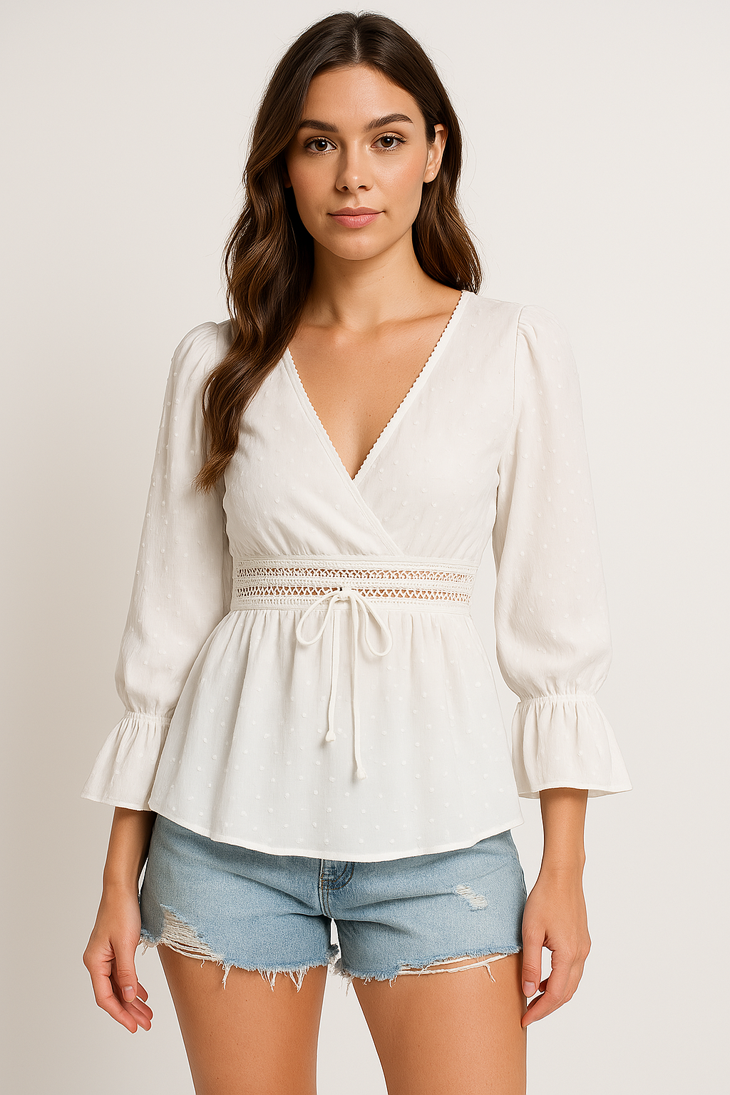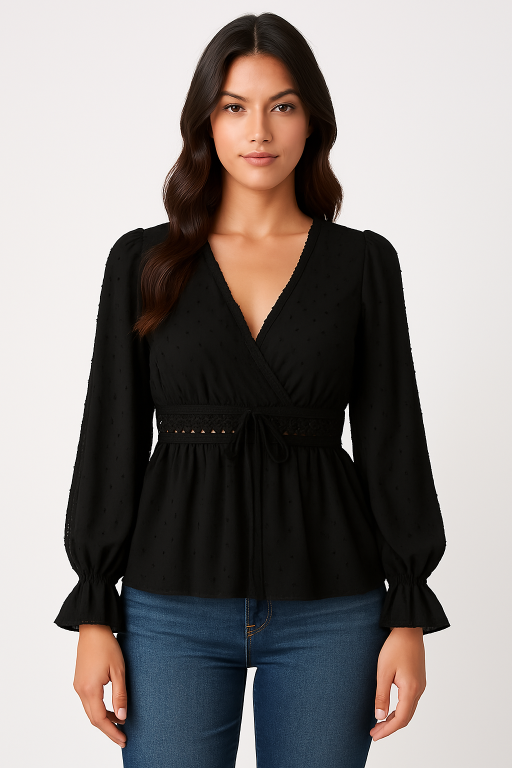 Damtop med V-ringning – Lång puffärm – Knytmidja – Spetsdetalj – Lös passform