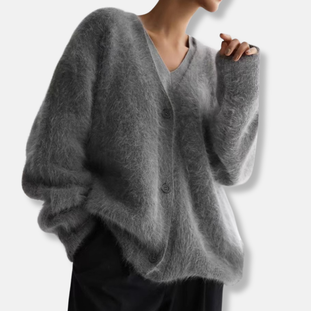- Design: Oversized passform, V-ringning med knappar, Borstad stickad struktur