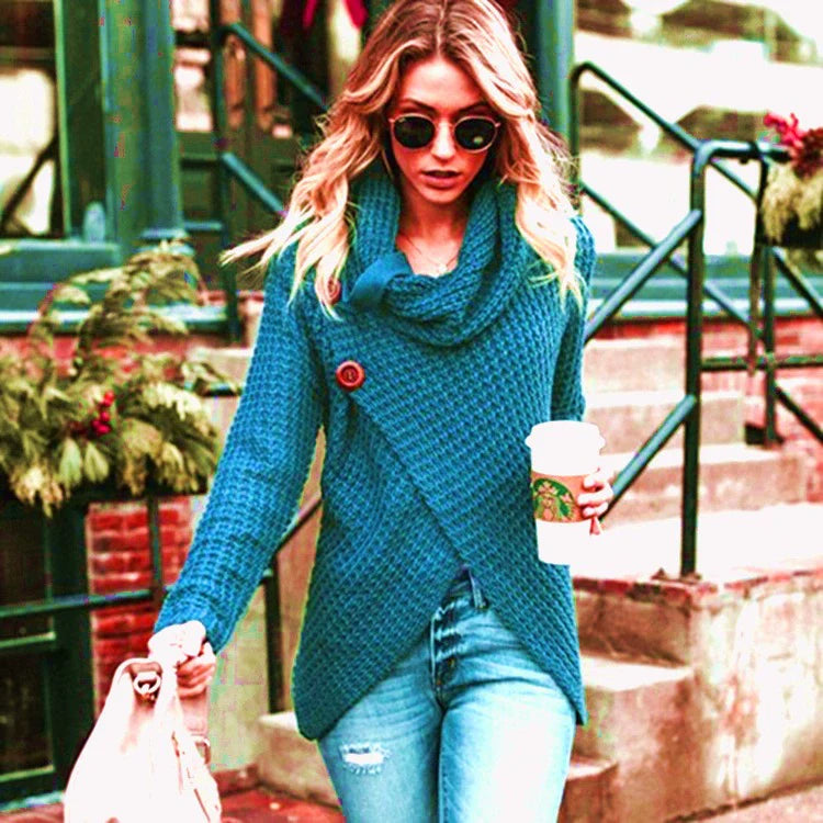 Damtröja – Avslappnad Passform – Stickad Ull – Hög Krage – Knappar Fram