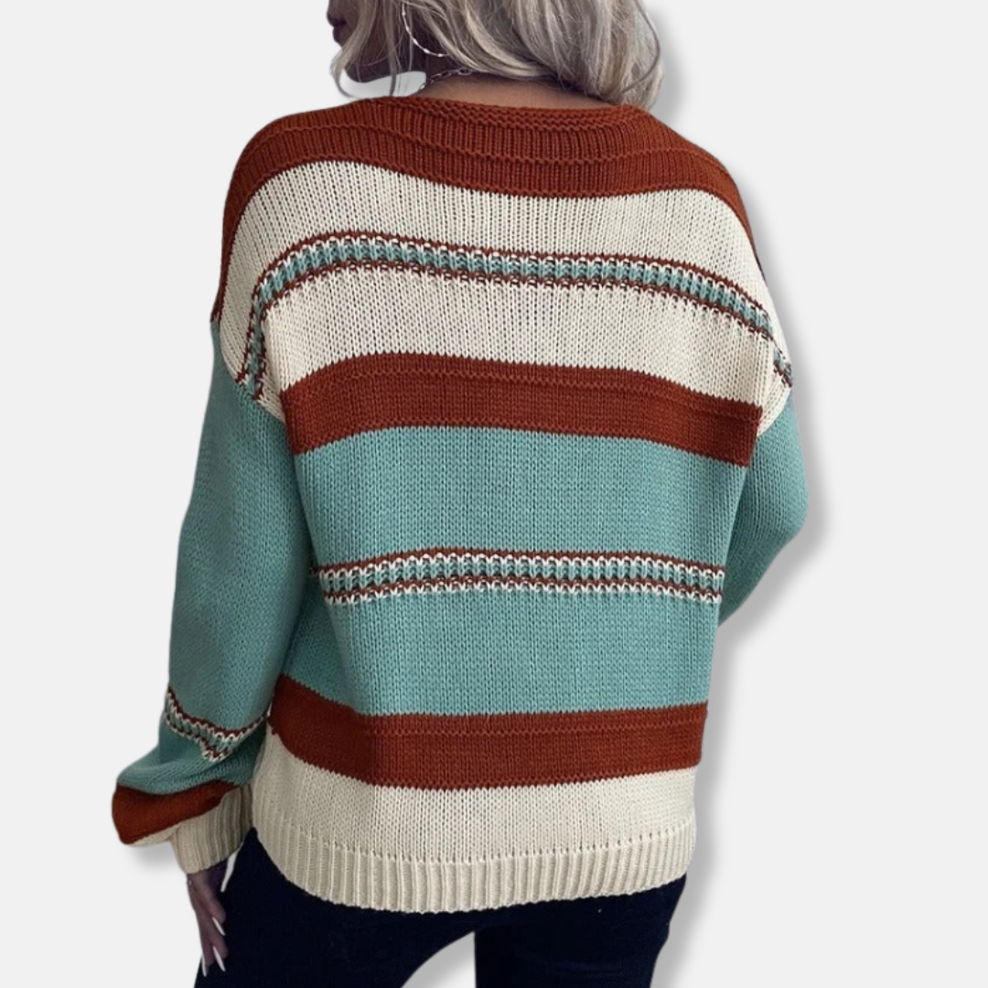 Damtröja – Avslappnad Passform – Stickad – V-ringning – Randigt Mönster – Lång Ärm