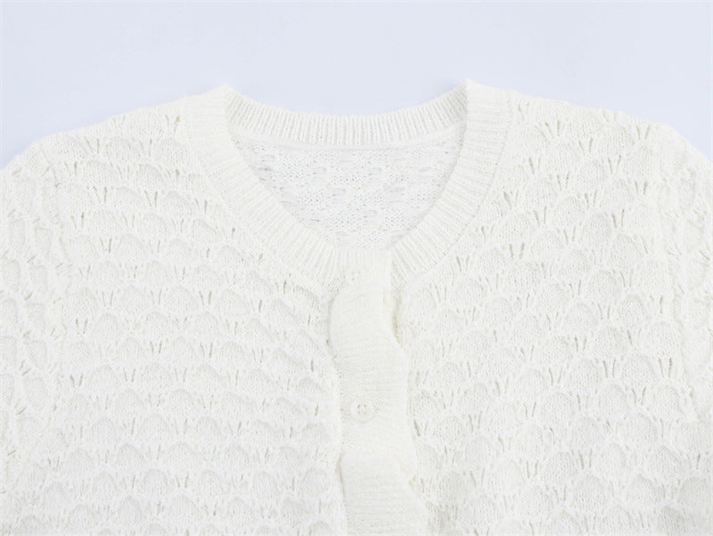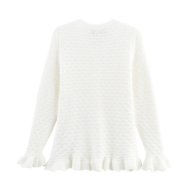 Ge din vardagsstil en touch av charm med denna rundhalsade enkelknäppta tröja för kvinnor, med eleganta volangdetaljer och en andningsbar stickad hålmönster. Perfekt att bära som lager på lager på våren eller hösten, ett mysigt men ändå elegant val för vardagliga dagar, kontorskläder eller helgutflykter.