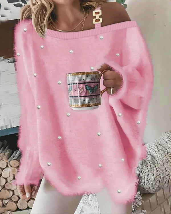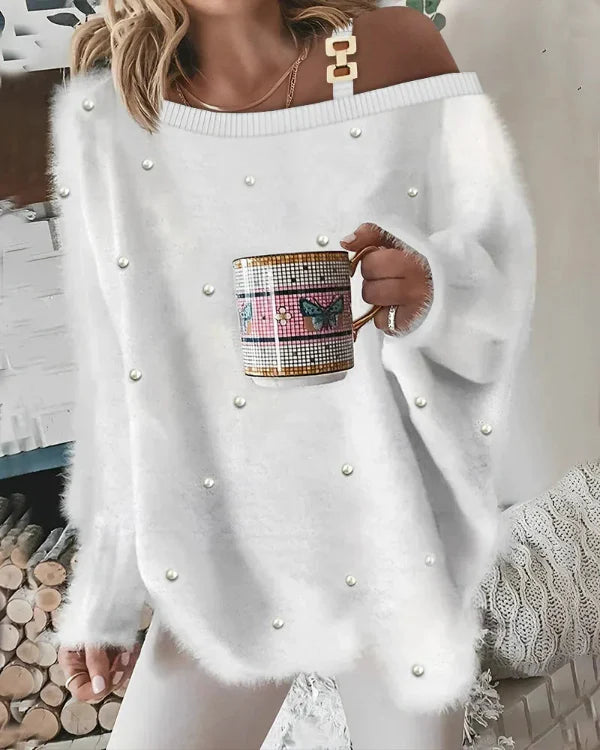 Damtröja med V-Ringning – Oversize Passform – Mjuk Textur – Pärldetaljer