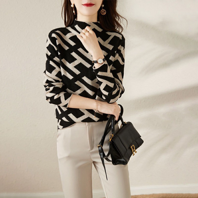 Damtröja – Ullmixstickad – Normal passform – Jacquardmönster – Hög hals