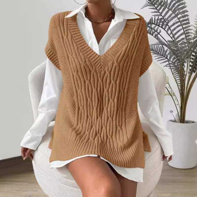 Damväst – Oversize Passform – Mjuk Kabelstickning – Djup V-ringning – Breda Ribbor. Upplev ultimat komfort och stil med denna kabelstickade damväst. Den oversized passformen, djupa V-ringningen och breda ribborna skapar en avslappnad men trendig look, perfekt för lager-på-lager-stilar. Ett måste i garderoben!