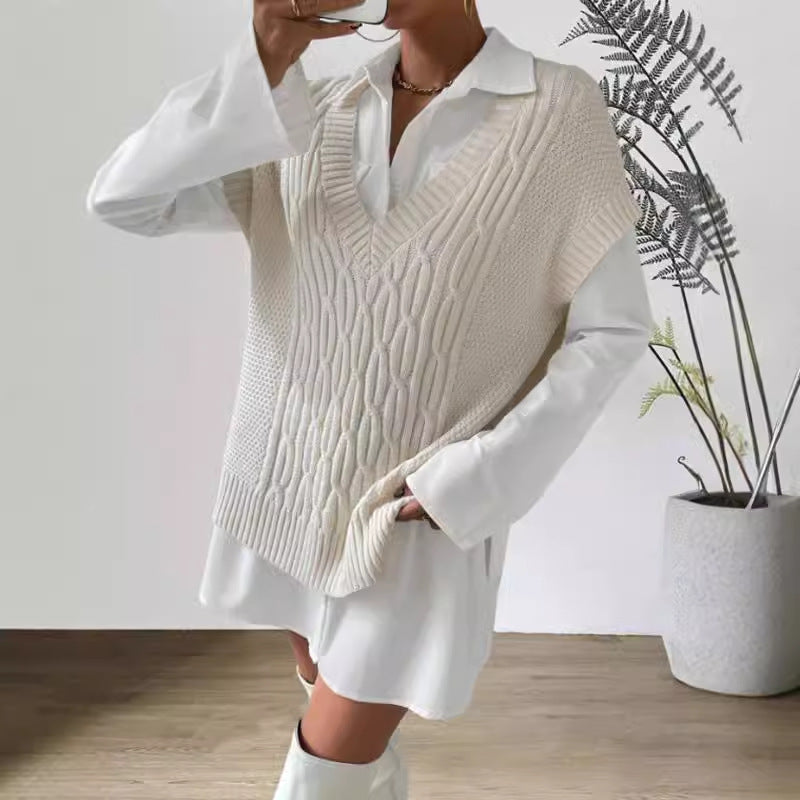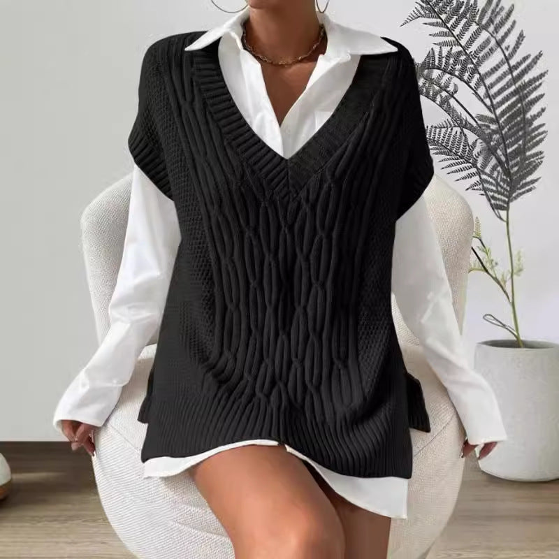 Damväst – Oversize Passform – Mjuk Kabelstickning – Djup V-ringning – Breda Ribbor