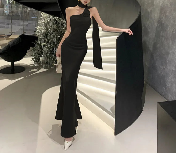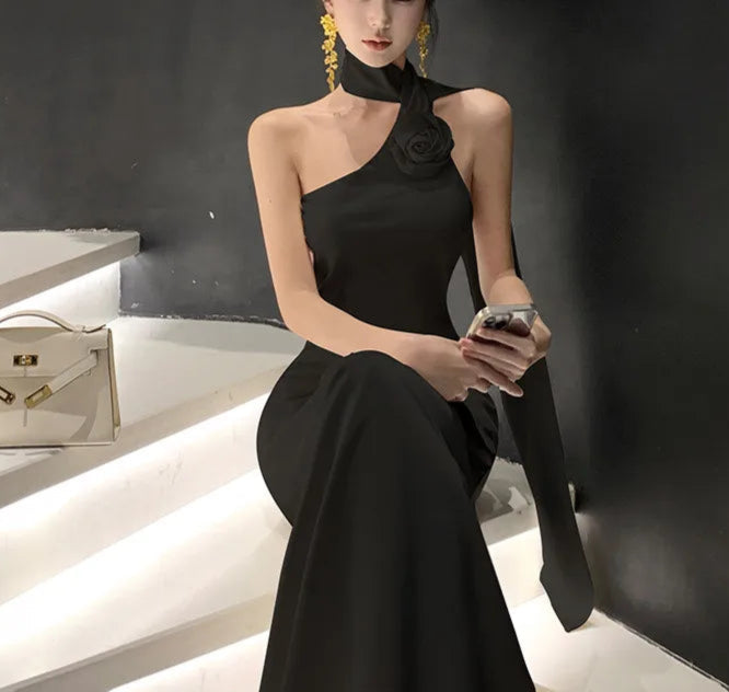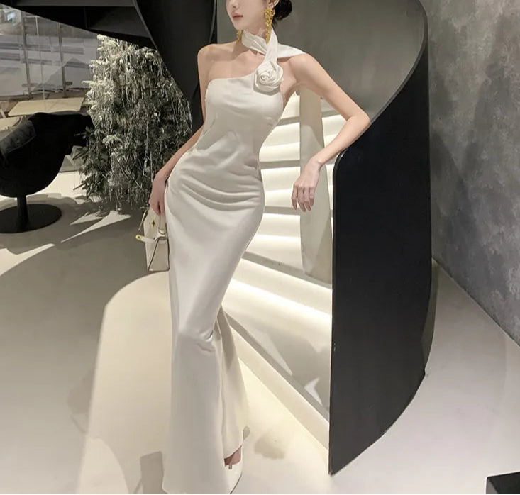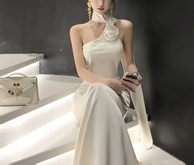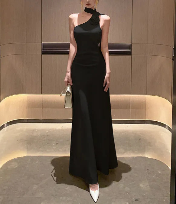 Elegant satinklänning med en axel för kvinnor – Aftonklänning i maximodell