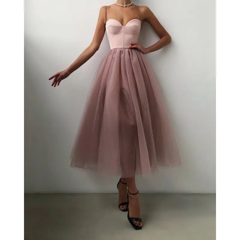 Elegant tyllklänning för kvinnor - Korsetttopp - Spaghettiband - A-linjeformad midiklänning