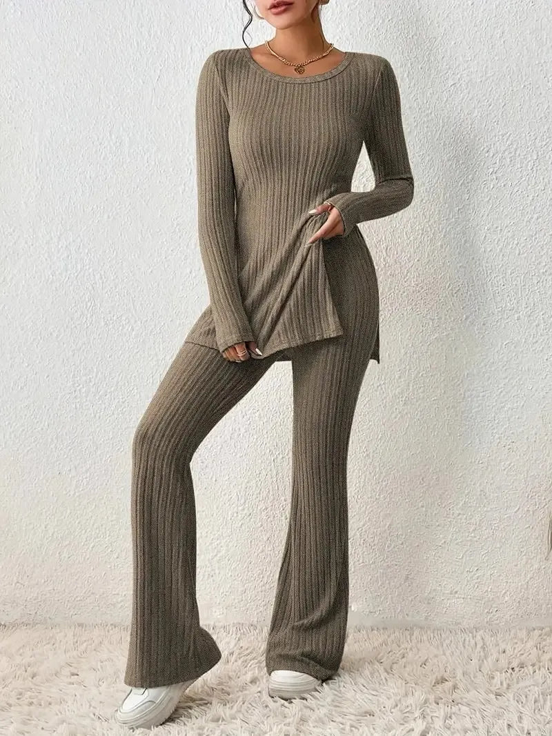 Kvinnors Stickat Set – Ribbad Tunika med Sidorslits – Stretchiga Leggings