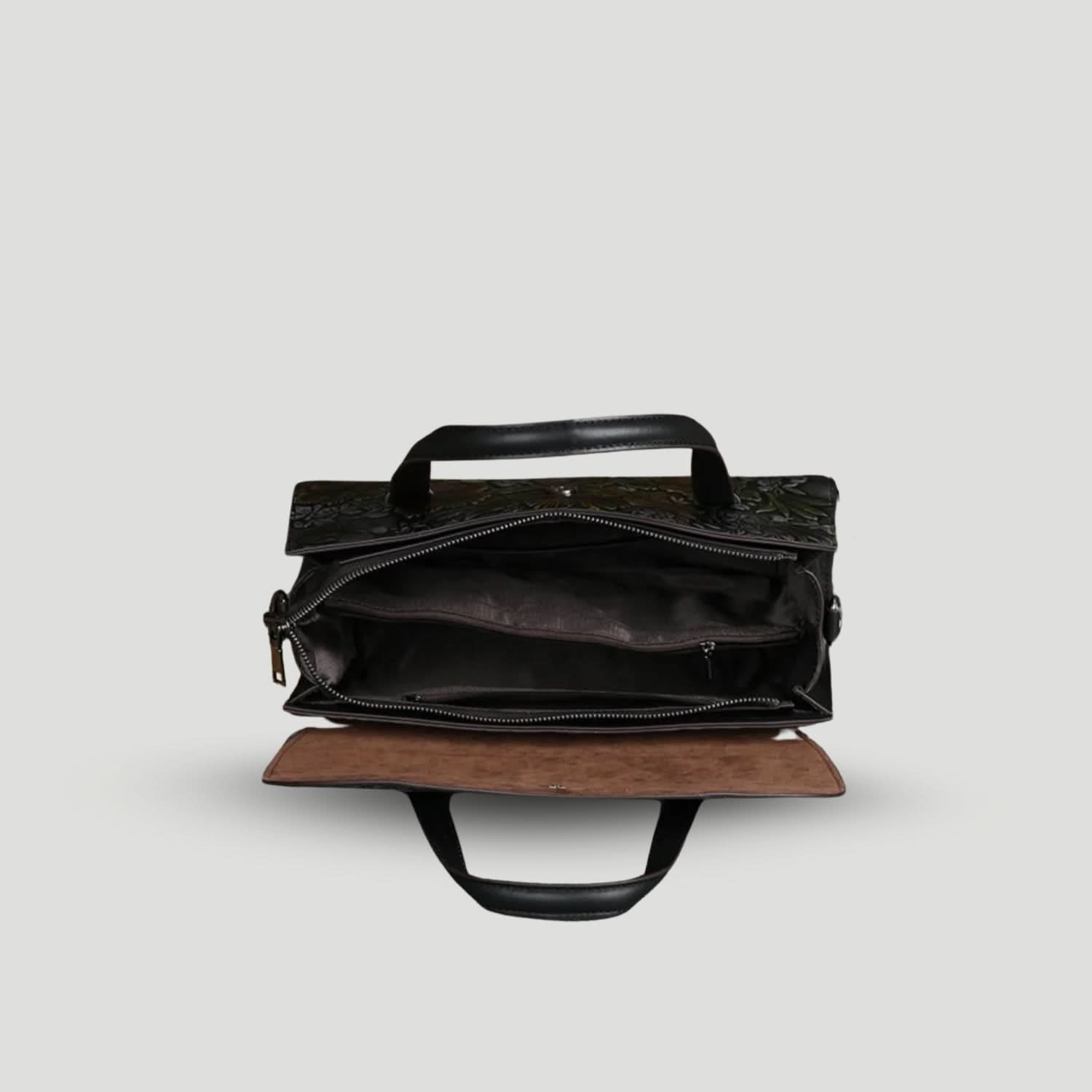 Förhöj din stil med Rudolf Emilia Handgjord Floral Väska, en fantastisk fusion av konstnärlighet och praktiskhet. Denna utsökta handväska har ett rikt svart yttre prydd med intrikata, handpräglade blommiga detaljer som vackert kombinerar elegans och charm.