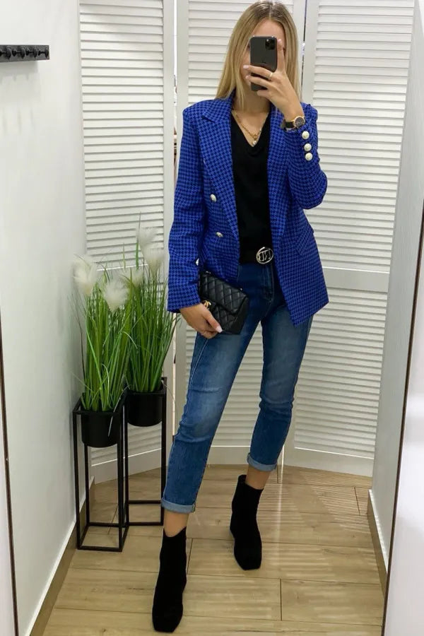 Förhöj din stil med vår hundtandsmönstrade kavaj för damer – en elegant blandning av tidlös elegans och modern stil. Med ett djärvt hundtandsmönster, dubbelknäppt design och iögonfallande knappar är detta ett enastående plagg som omedelbart ger en sofistikerad look till vilken outfit som helst.