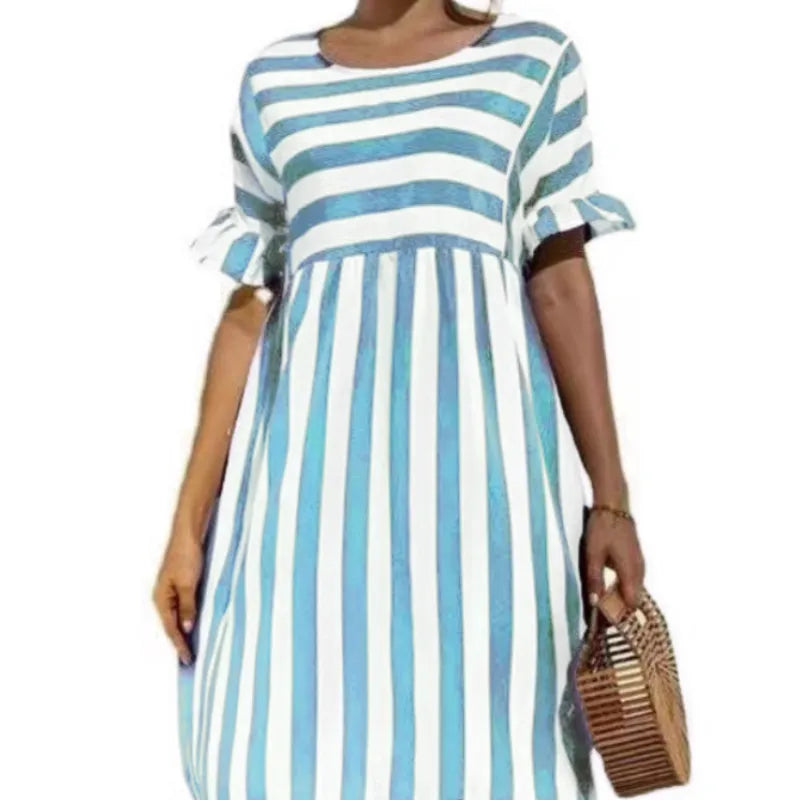 Upplev enkel sofistikation med vår Nautical Stripe Shift Dress - din perfekta följeslagare för alla sommarens tillställningar. Inspirerad av den tidlösa elegansen i sjöfartsmode, denna luftiga klänning har klassiska horisontella ränder som lägger till en lekfull rytm till din garderob.