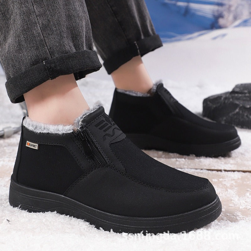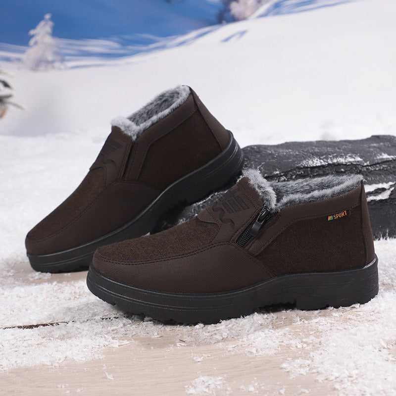 Dessa ankelkängor för herr kombinerar vävd textil med ett mjukt fuskpälsfoder för vinterkomfort. De är försedda med en praktisk dragkedja på sidan och en halkfri sula.