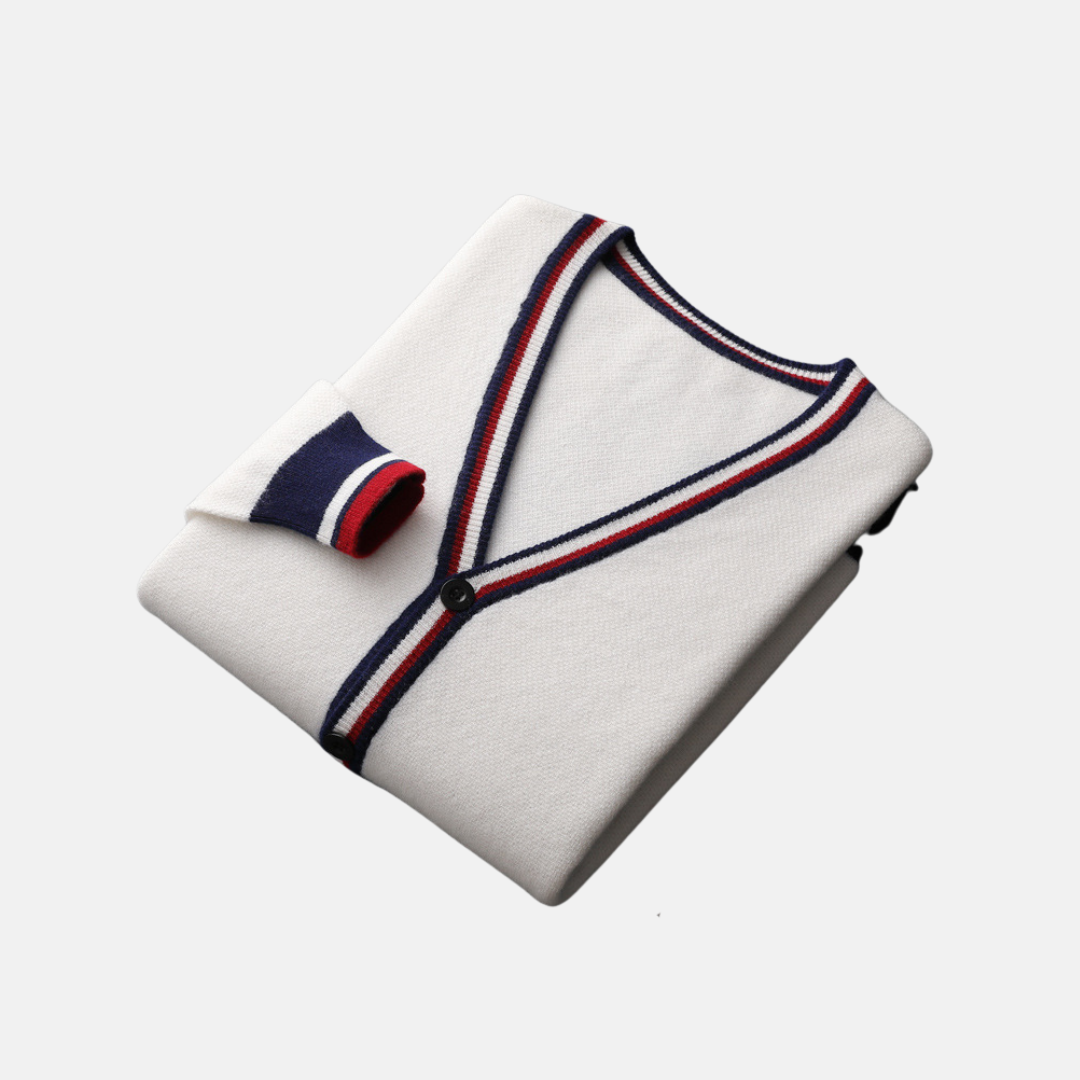 - Design: Lös passform med randig ribbstickad V-ringning.