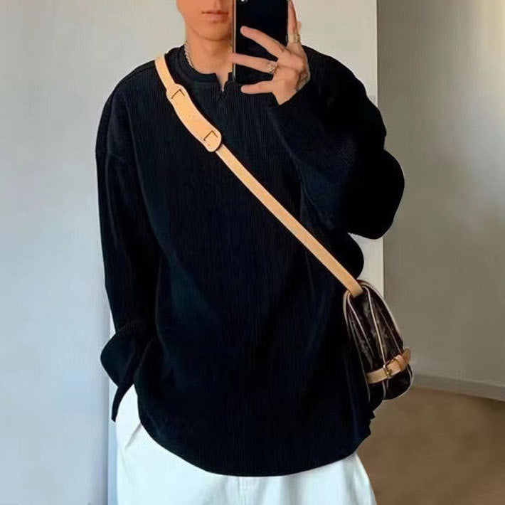 Herr långärmad T-shirt – Ribbstickad – Avslappnad passform – V-ringning – Andningsbar