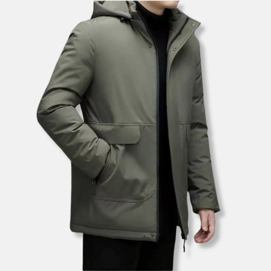 Herrjacka med Huva – Vadderad – Vindavvisande – Normal Passform – Höftlång