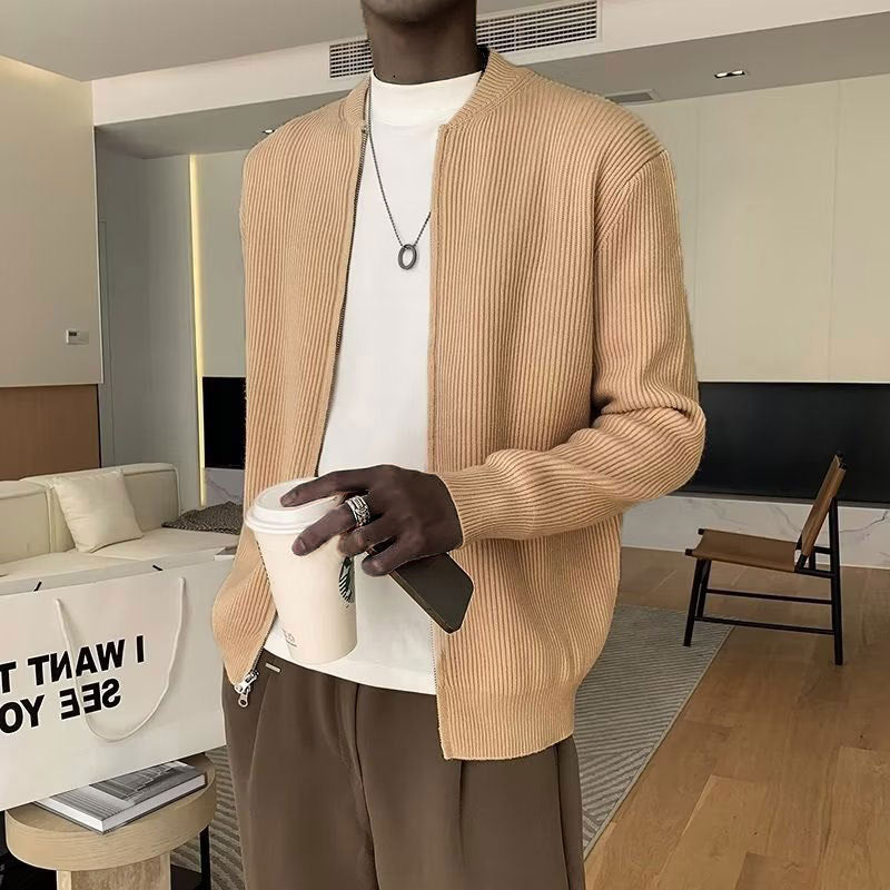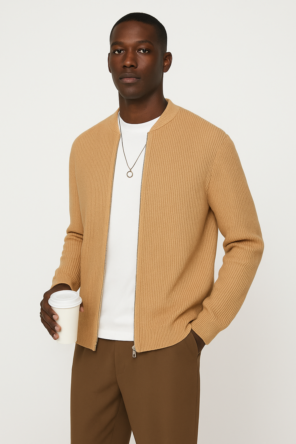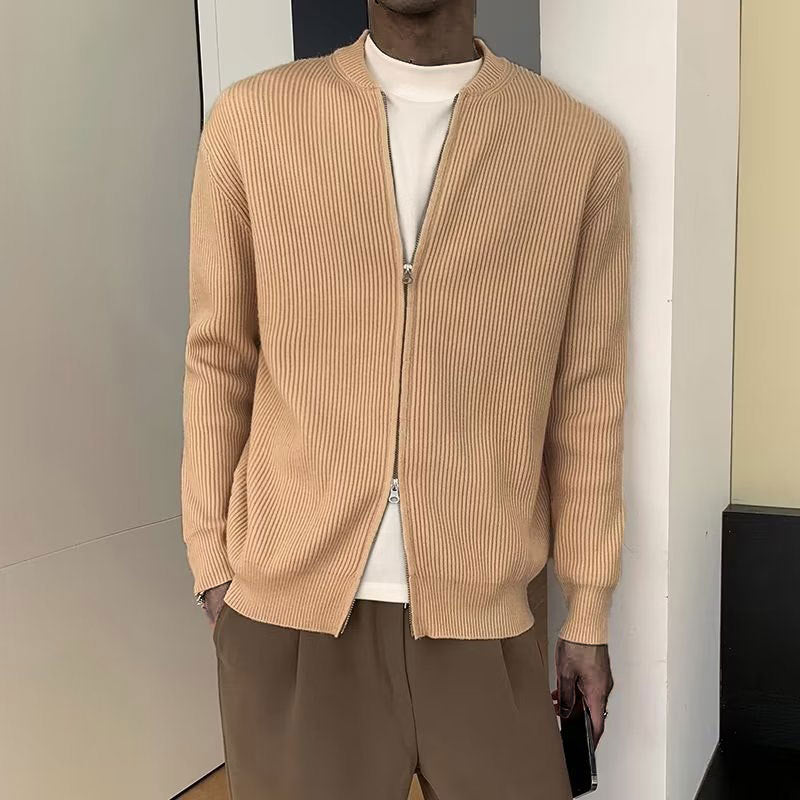 Herrkofta – Avslappnad Passform – Mjuk Ribbad Stickning – Tvåvägsdragkedja – Lång Ärmslut