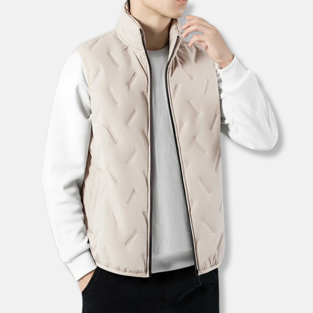 Upptäck vår Väst Quiltad med Isolerad Ståkrage, en stilren herrväst med varmt quiltat fiskbensmönster och ärmlös design för optimal rörelsefrihet. Perfekt för kyliga dagar.