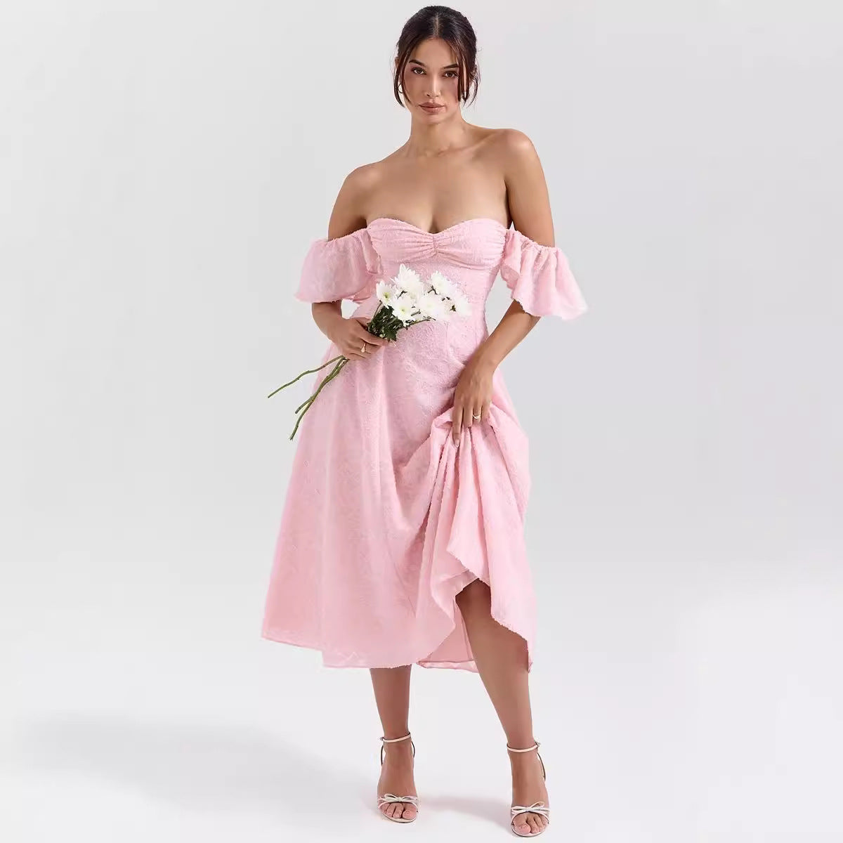 Klänning dam midi – Jacquardtyg – A-linjemodell – Fyrkantig urringning – Volangärmar