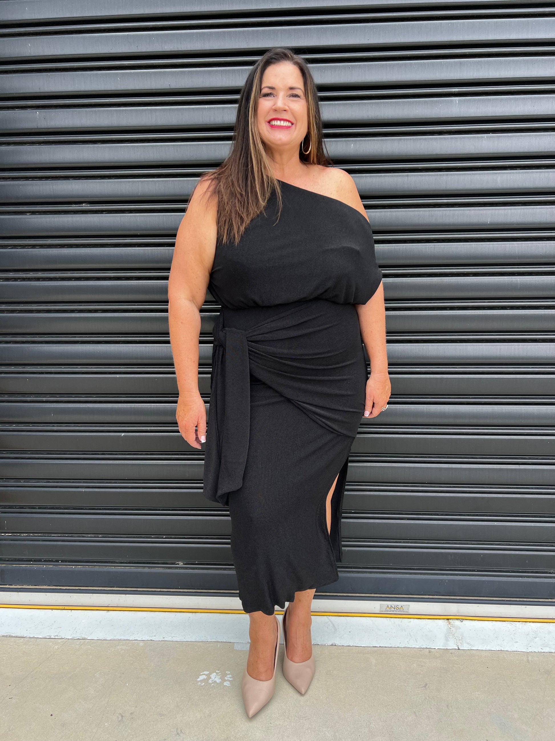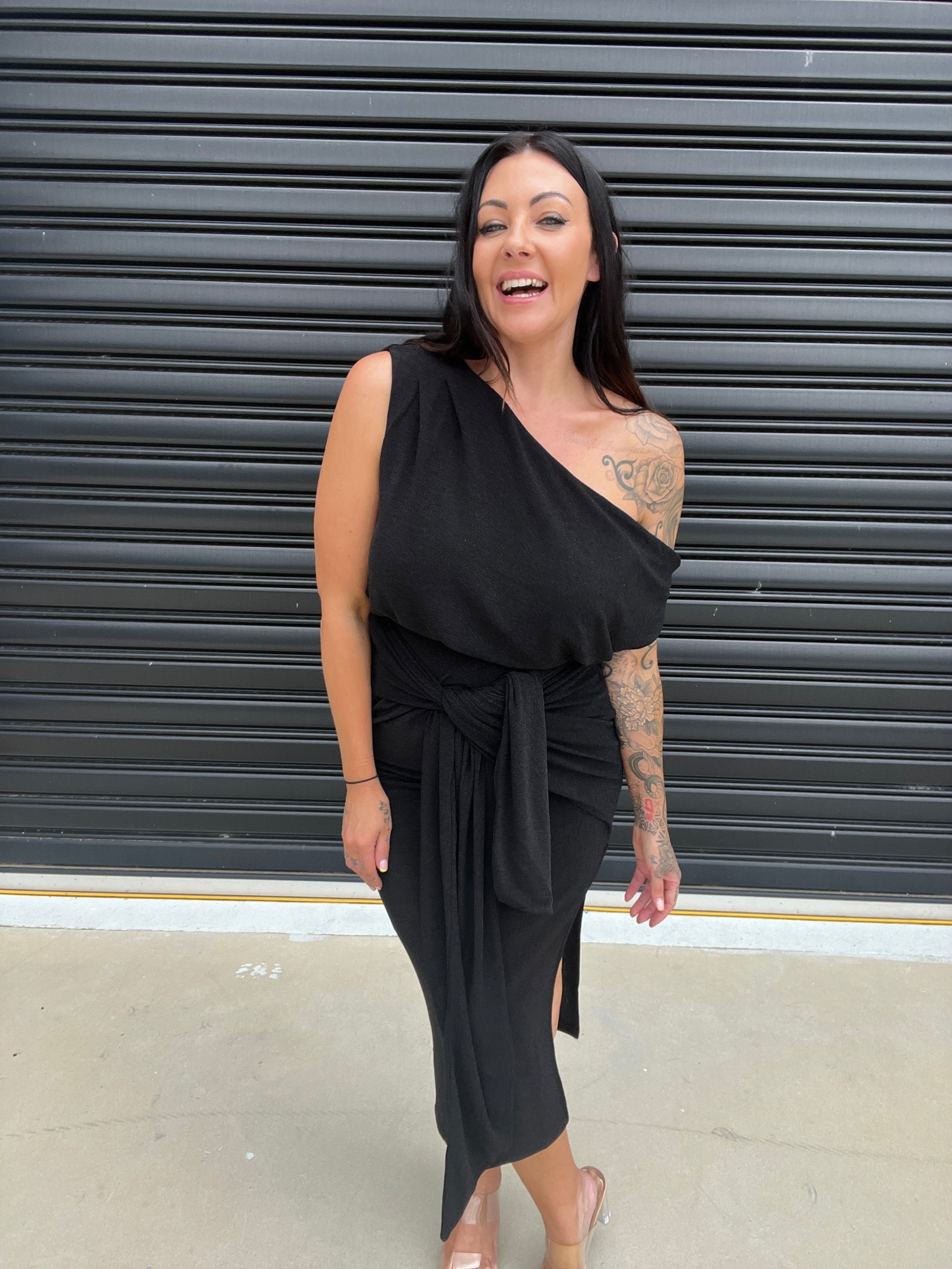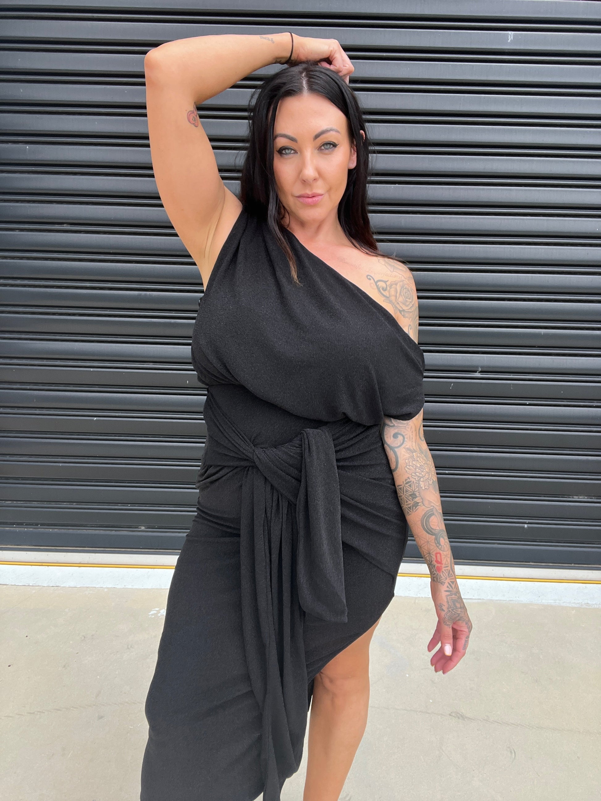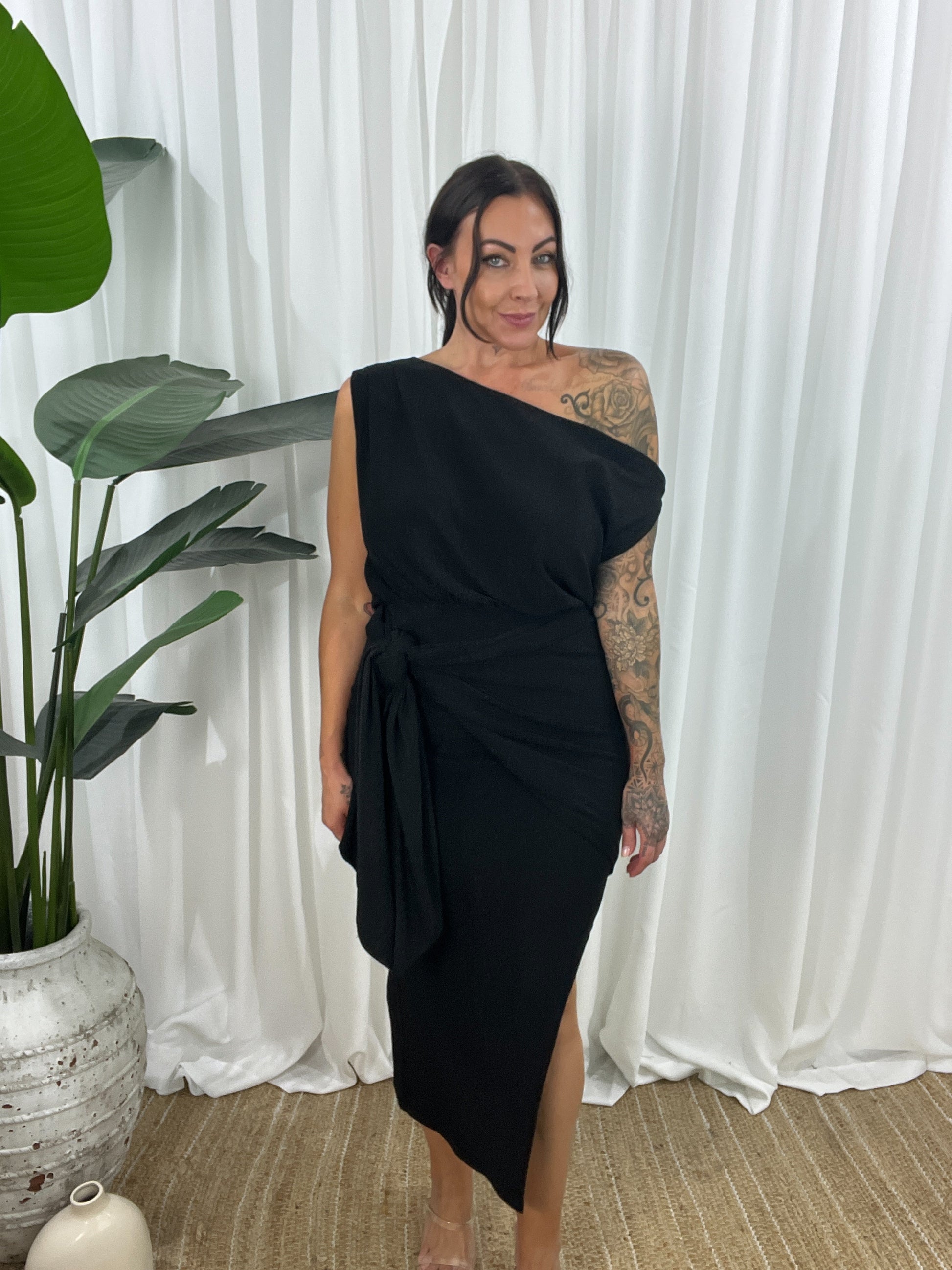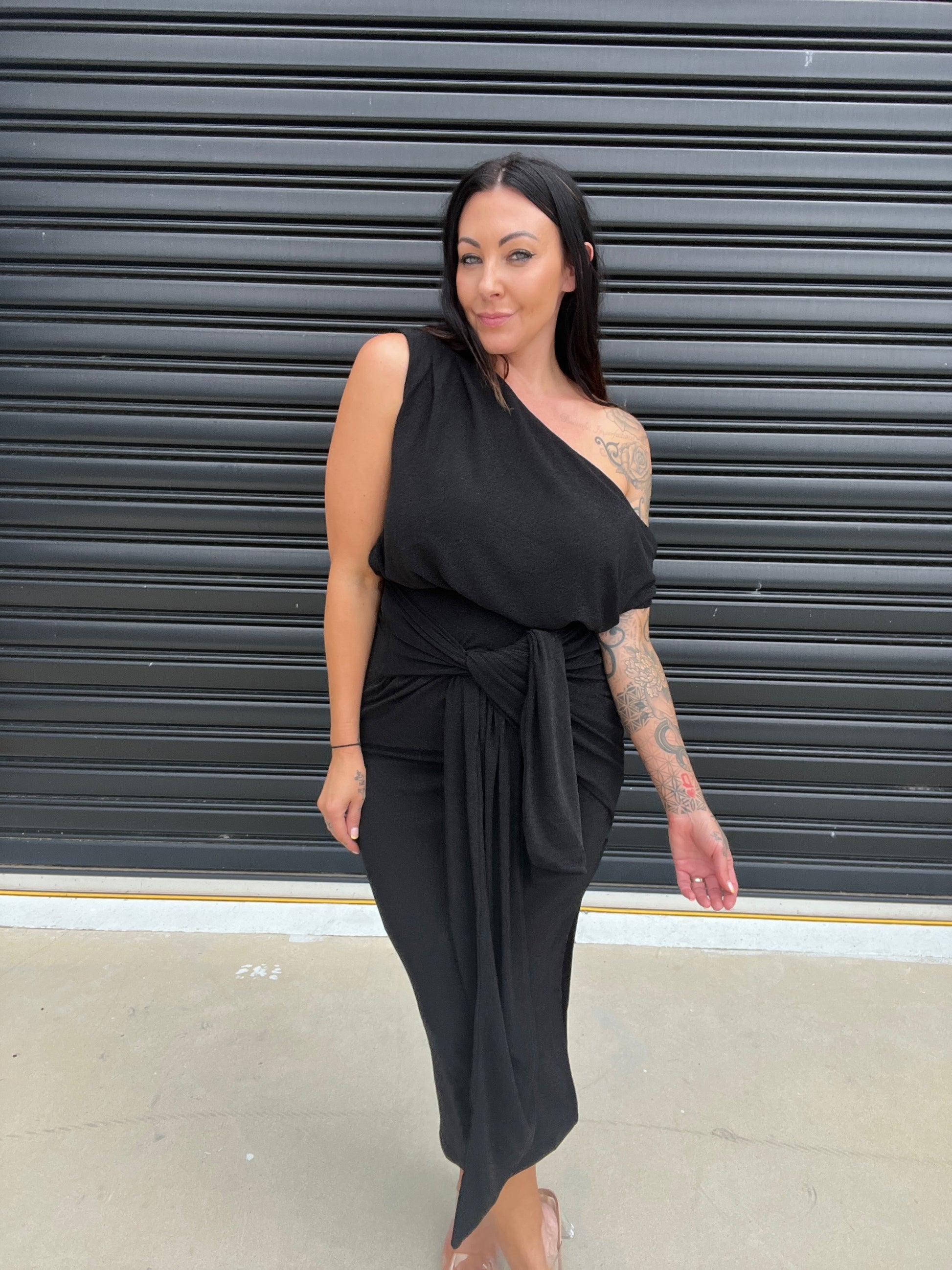 Klänning dam Enaxlad Figurnära Asymmetrisk med knut. Denna eleganta enaxlade klänning från Eva Jansson har en smickrande figurnära passform och en unik asymmetrisk fåll med en vacker knutdetalj i midjan. Perfekt för en sofistikerad look.