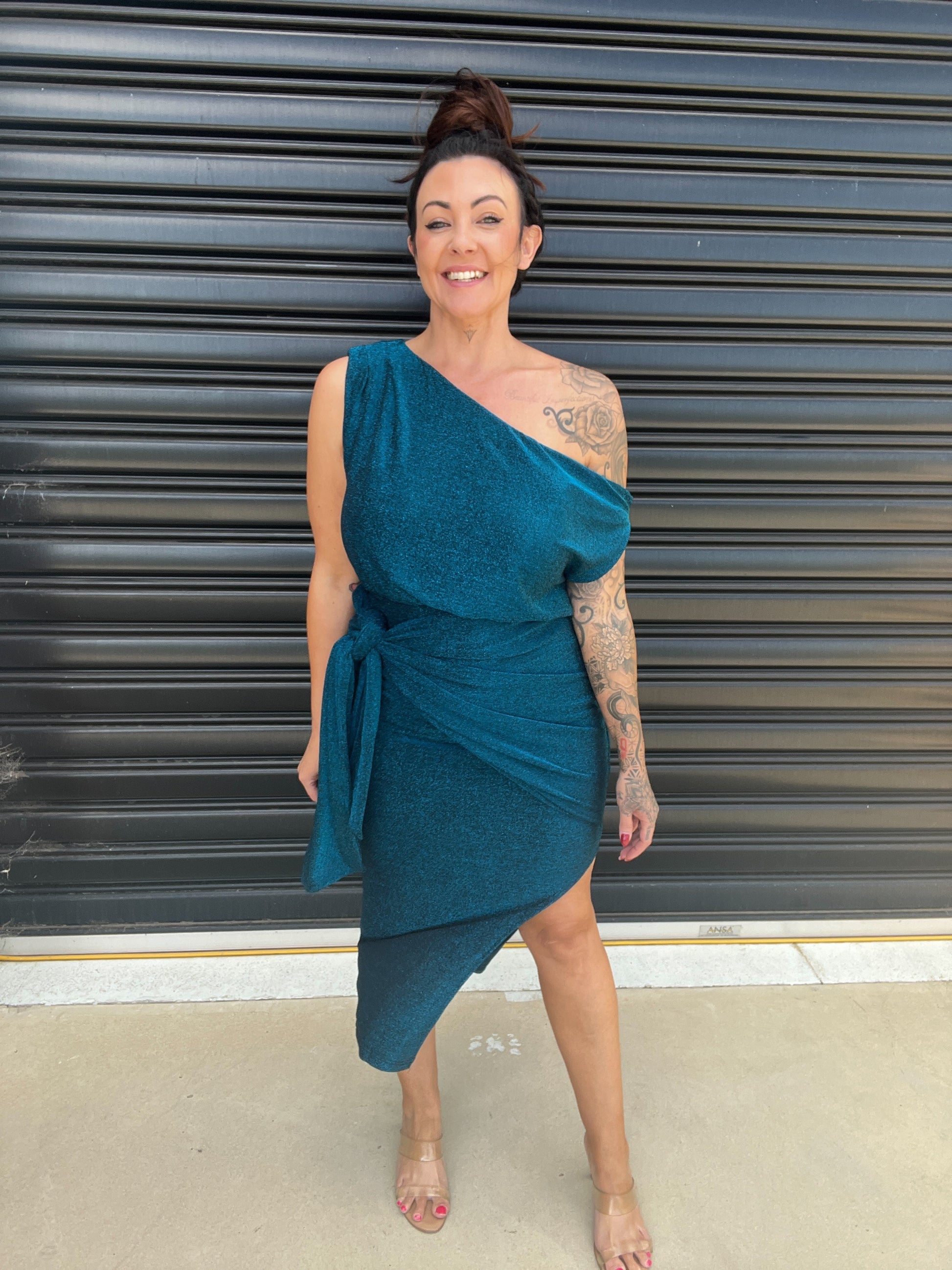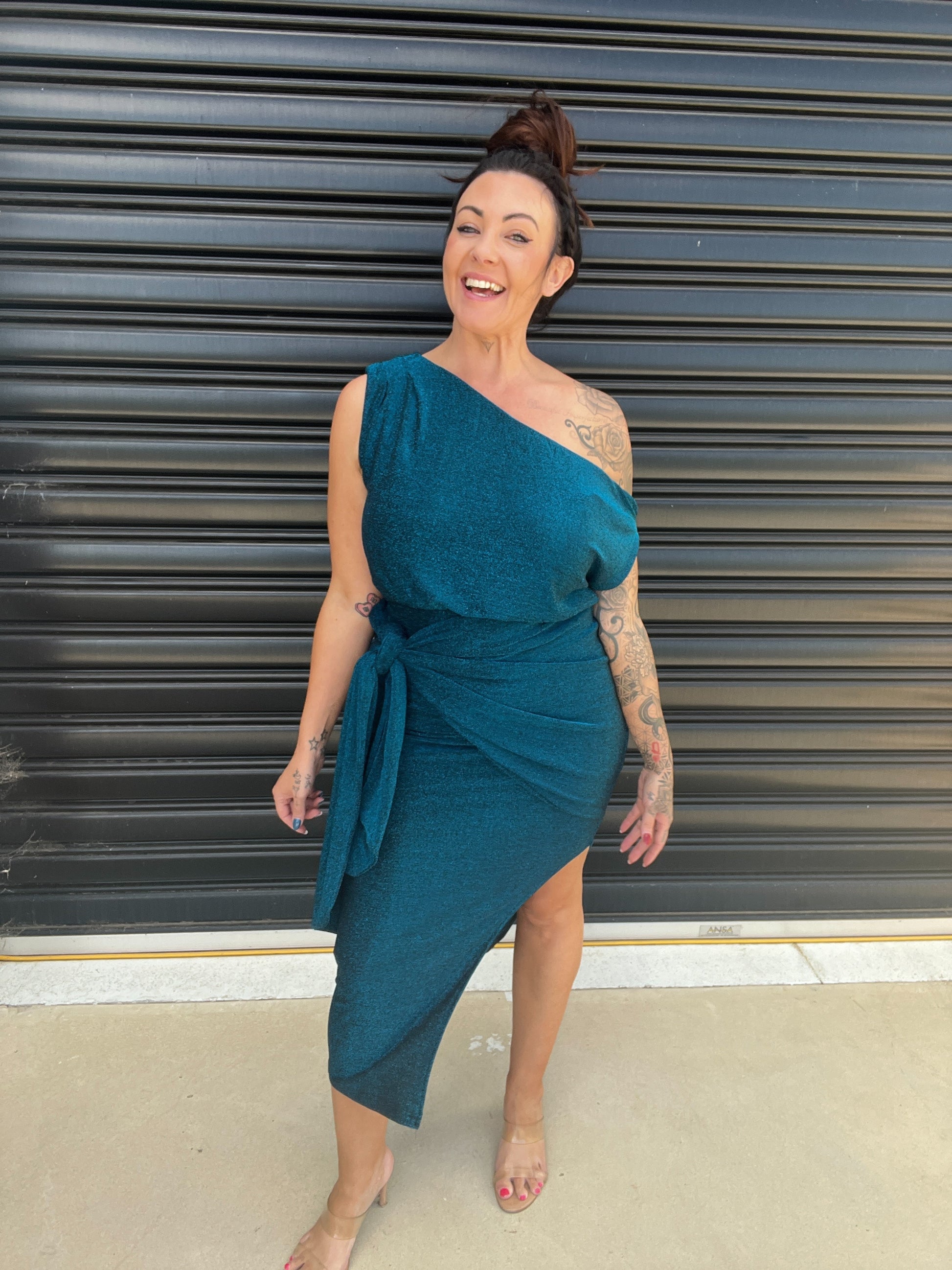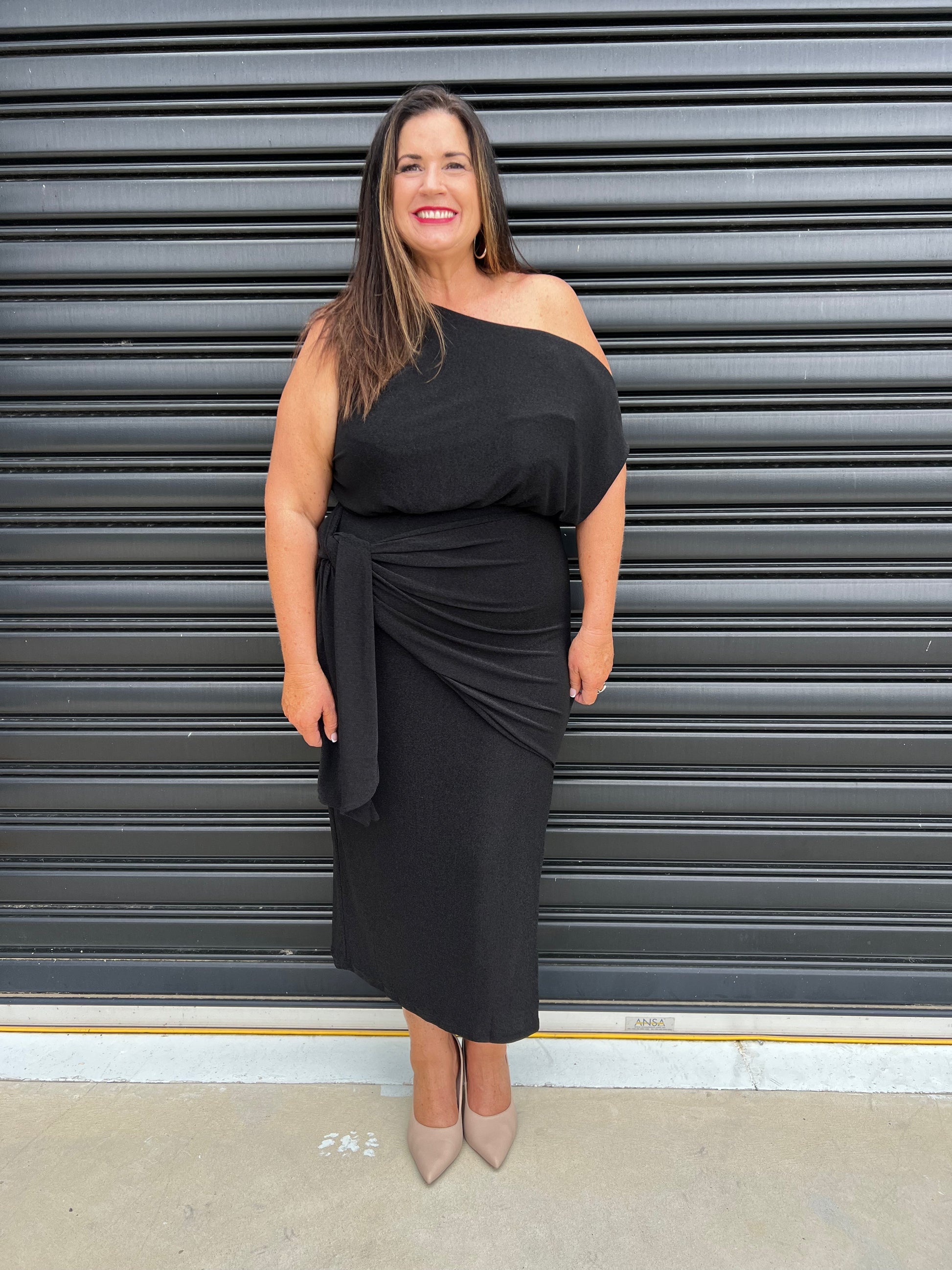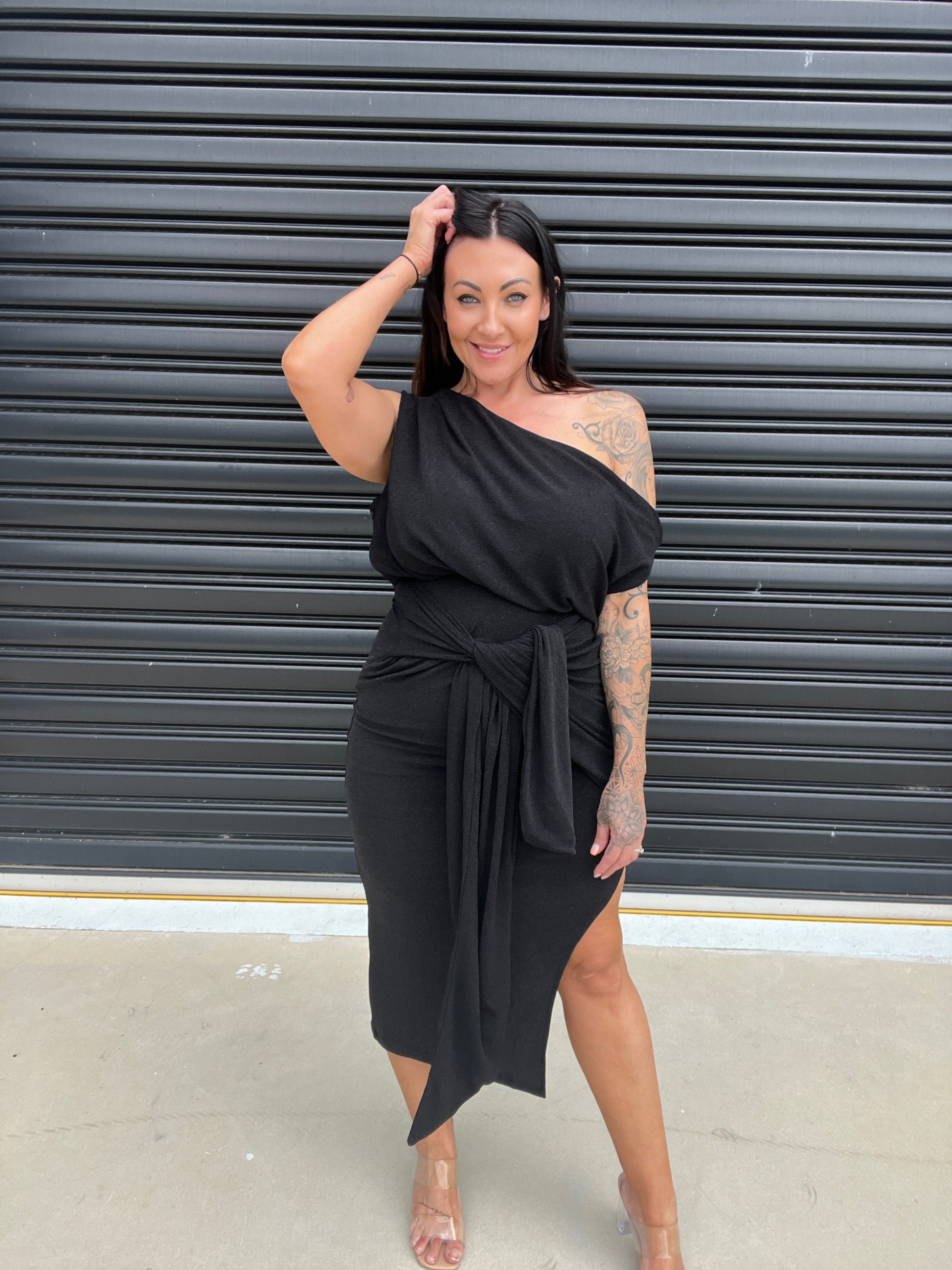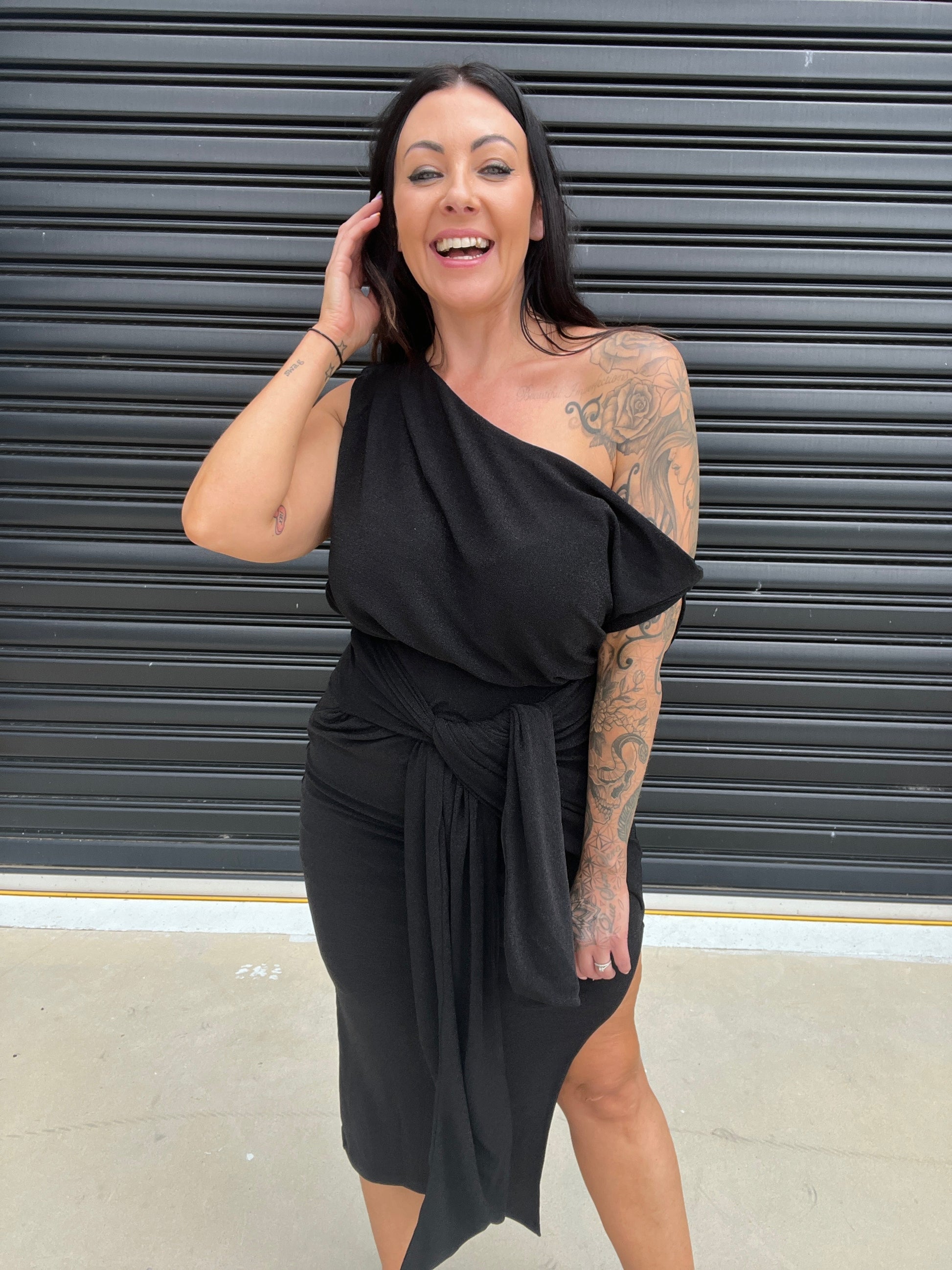 Klänning dam Enaxlad Figurnära Asymmetrisk med knut. Denna eleganta enaxlade klänning från Eva Jansson har en smickrande figurnära passform och en unik asymmetrisk fåll med en vacker knutdetalj i midjan. Perfekt för en sofistikerad look.