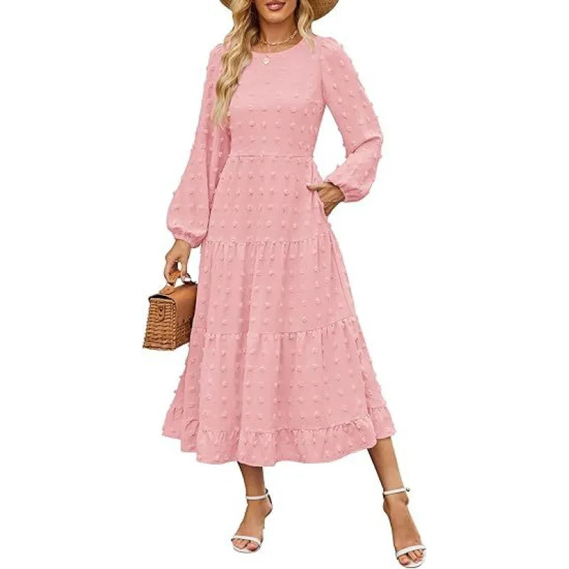 Kliv ut i elegant stil med vår långärmade maxiklänning som kombinerar avslappnad komfort med elegant design. Den graciösa rundade halsringningen och den schweiziska prickiga texturen ger en touch av fantasi till denna avslappnade ensemble, perfekt för alla tillfällen. Oavsett om du ska på en trädgårdsfest eller tar en lugn promenad, kommer denna lager-på-lager-klänning att få dig att känna dig elegant och avslappnad.