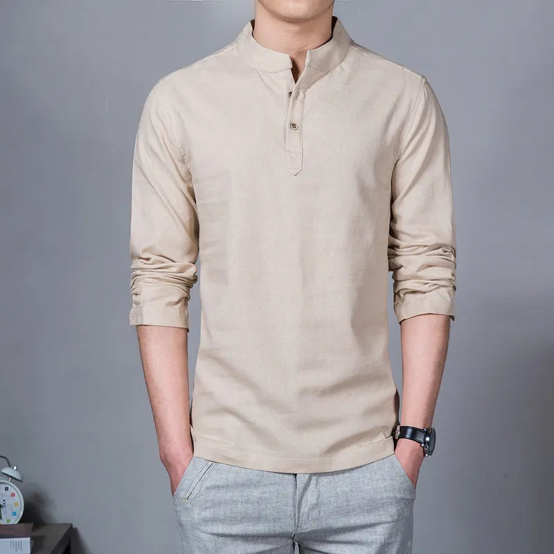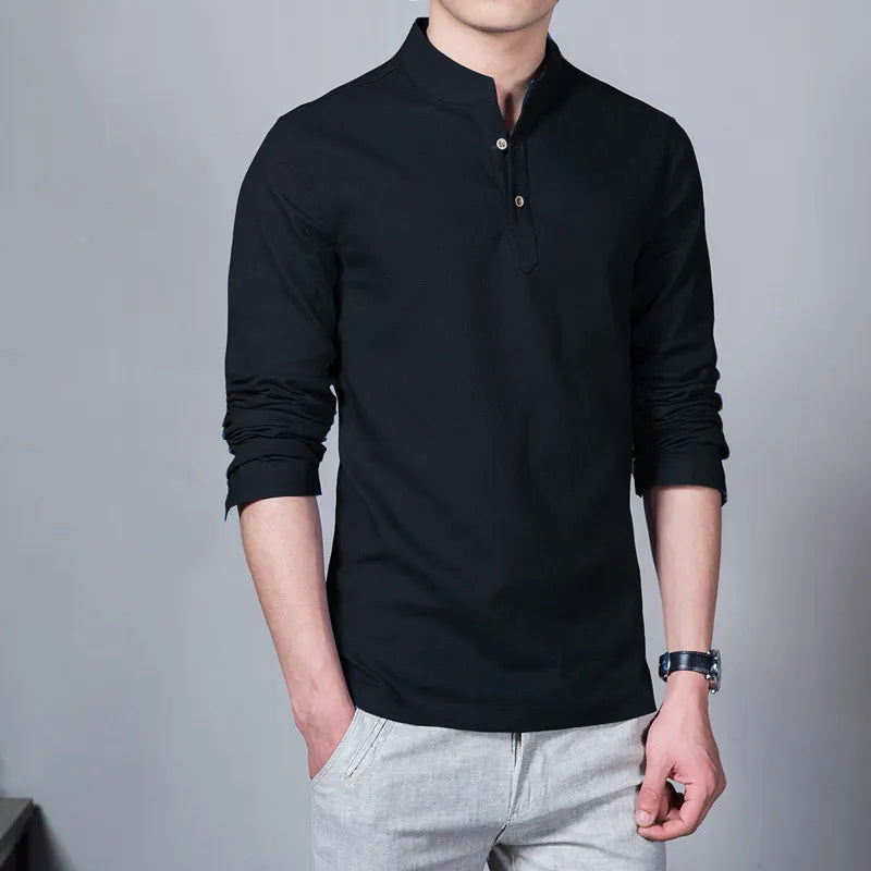 Herrskjorta med lång ärm och mandarinkrage, avslappnad