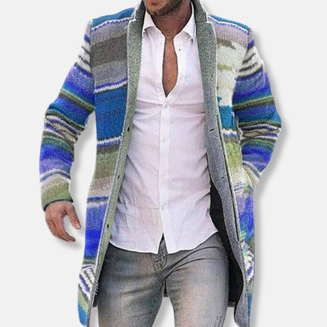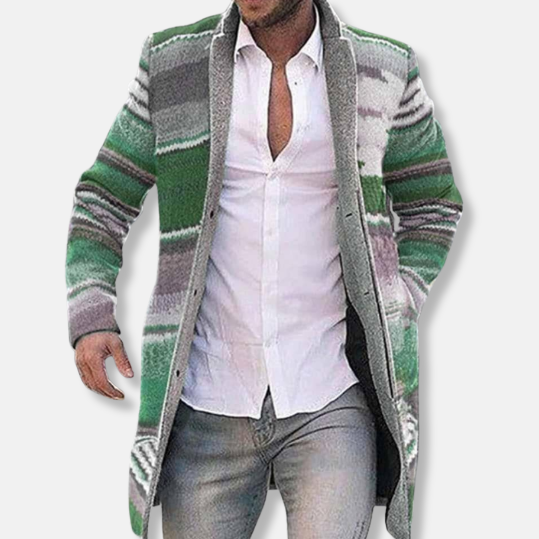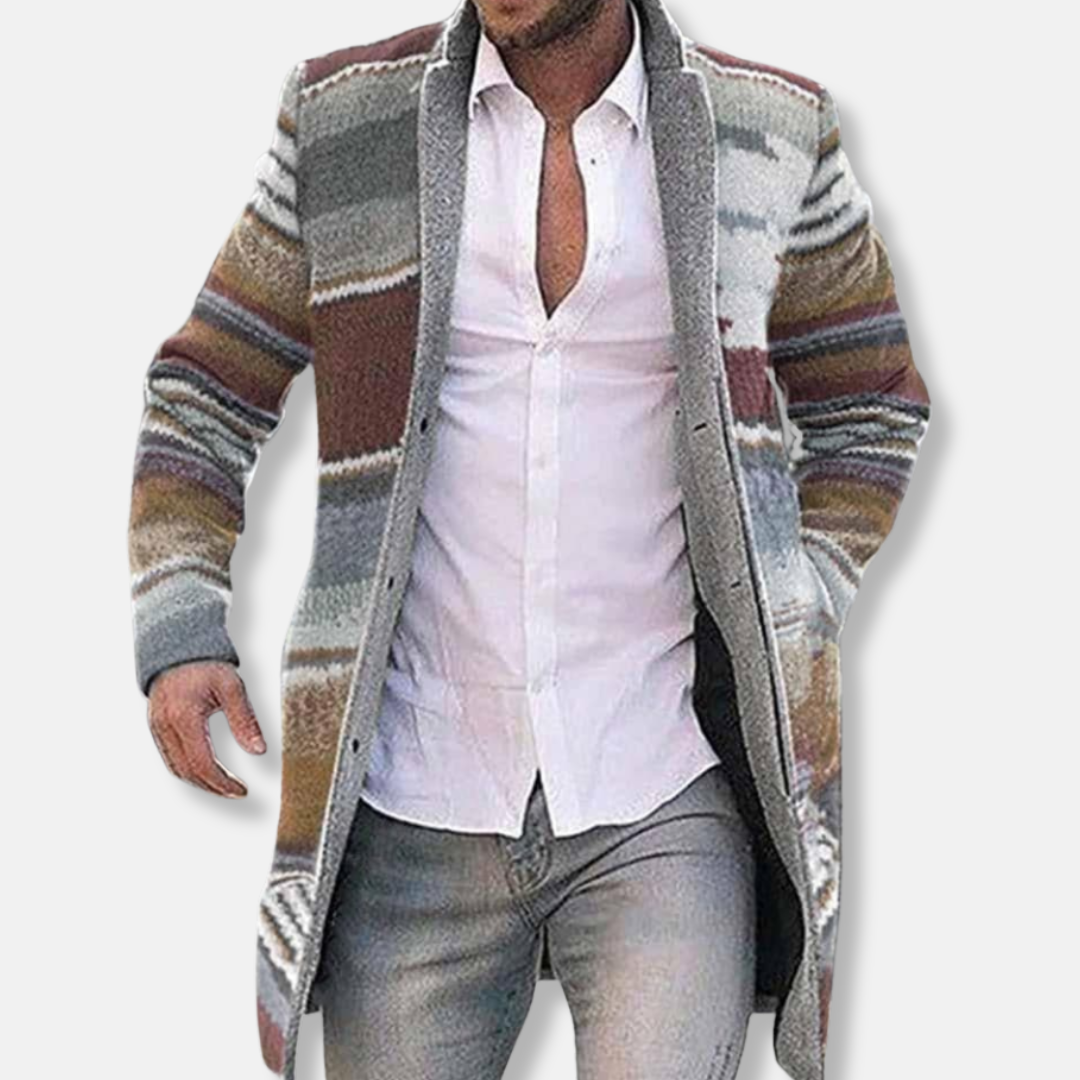 Denna knälånga kappa erbjuder en generös oversized passform, perfekt för en avslappnad men ändå sofistikerad stil. Med sitt distinkta randiga mönster och praktiska detaljer som knäppning fram och rymliga fickor, kombinerar den funktionalitet med modern estetik. Dess långärmade design och krage gör den till ett utmärkt val för vardagsbruk, där den ger både värme och en elegant framtoning.