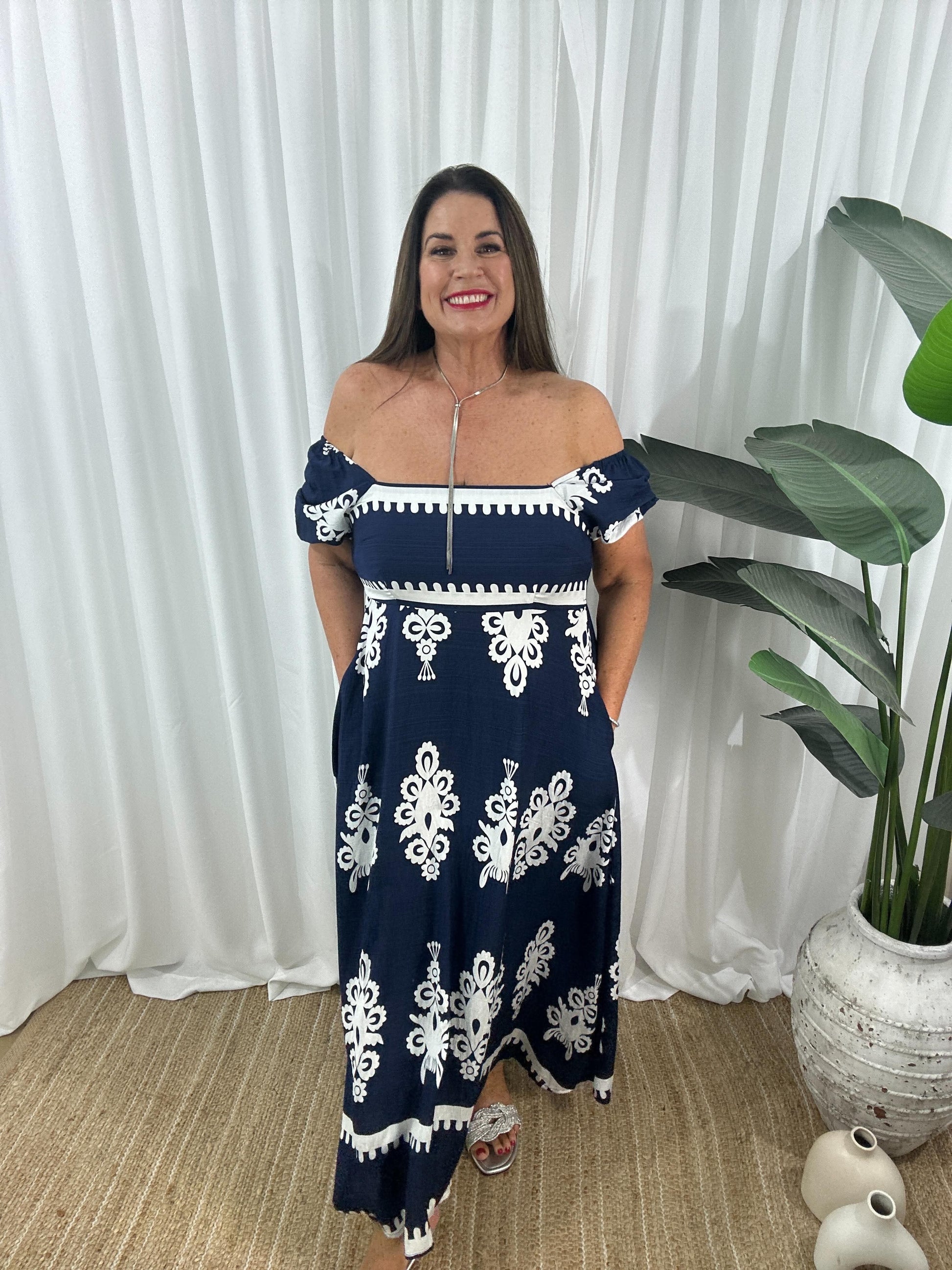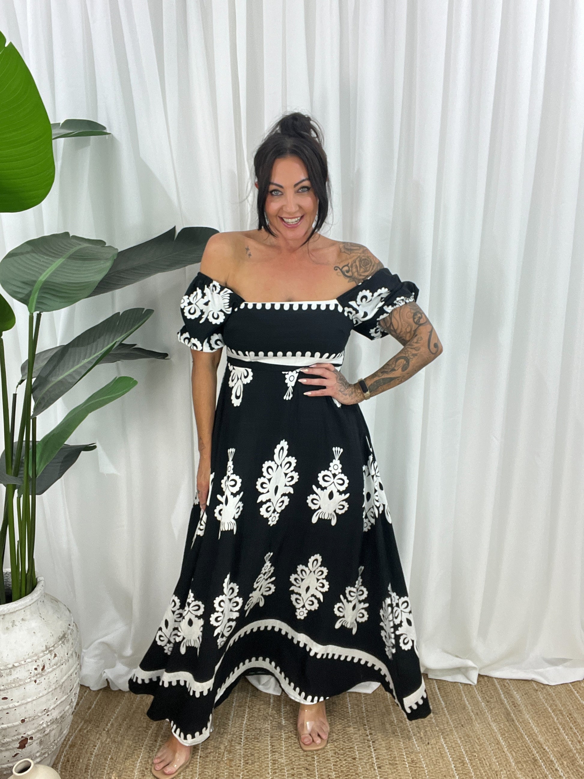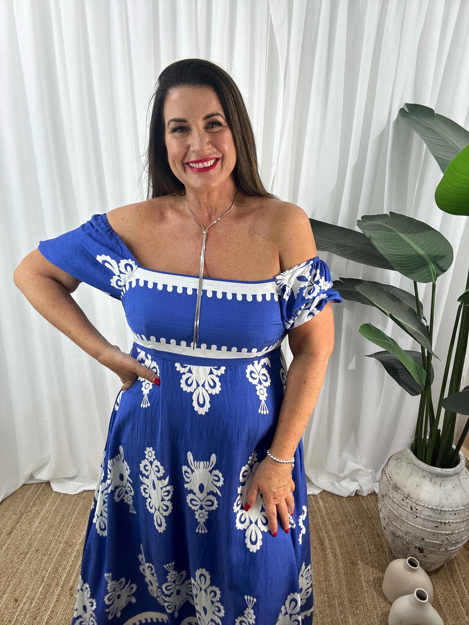 Upptäck din nya favorit: Axelbandslös Maxiklänning med Kort Ärm! Denna luftiga och mönstrade maxiklänning från Eva Jansson kombinerar komfort med stil. Perfekt för varma dagar och sommarkvällar.